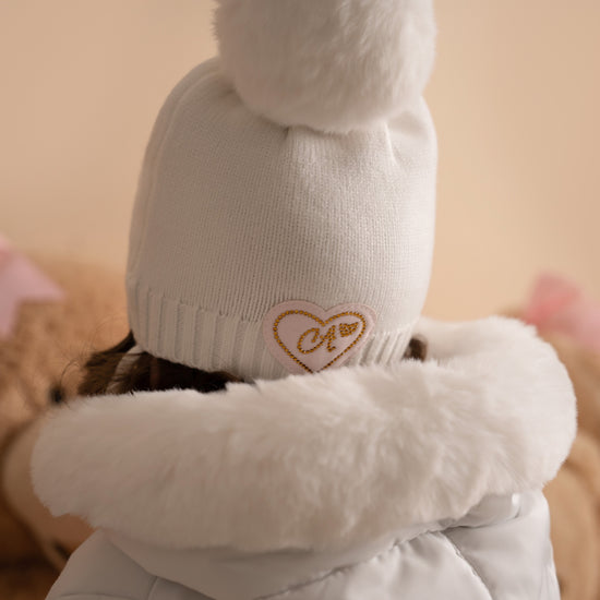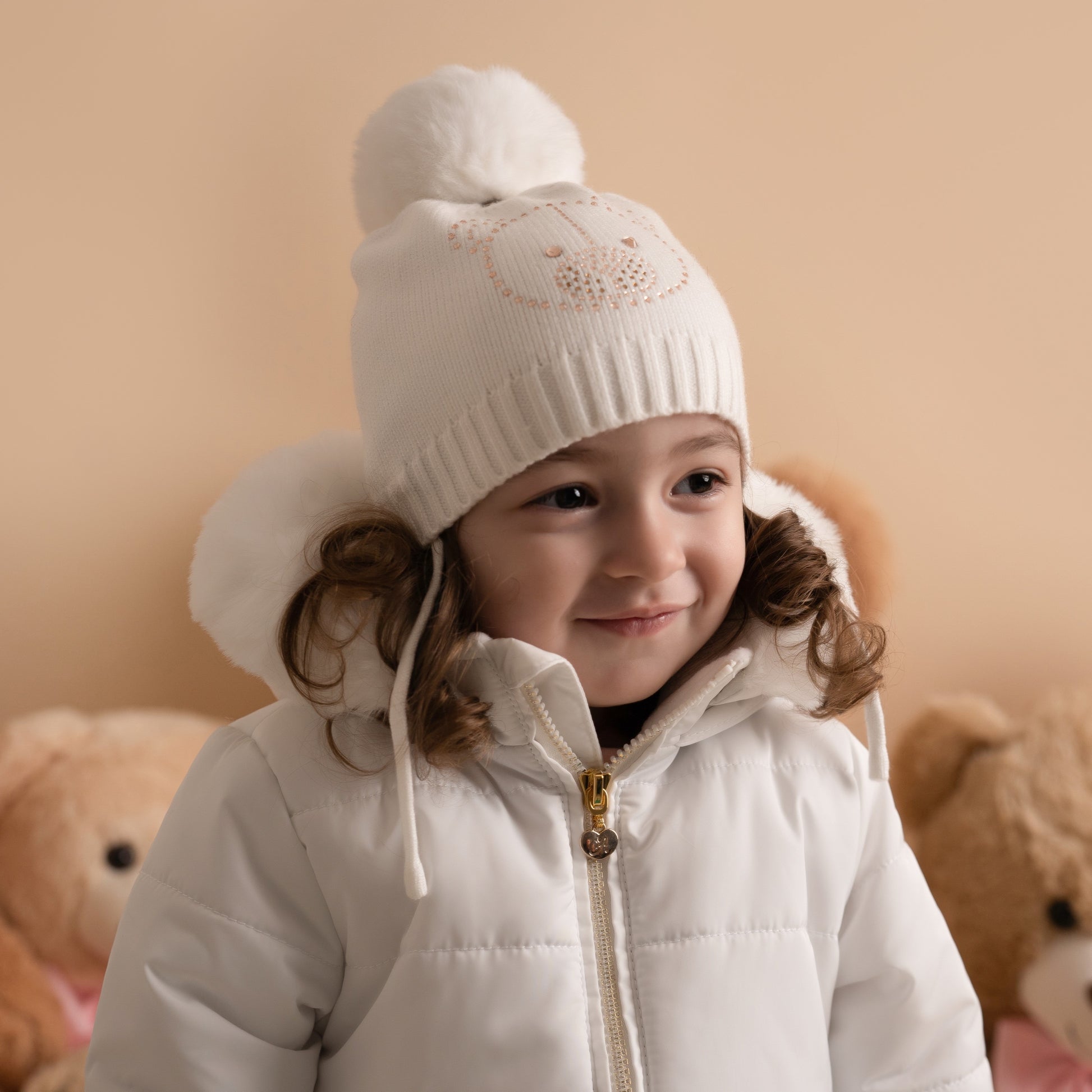 Stay cosy and stylish with the Glynne Hat. Made with a detachable faux fur pom pom and diamante teddy on the front, the knitted hat also features a heart logo on the back. Perfect for chilly days.