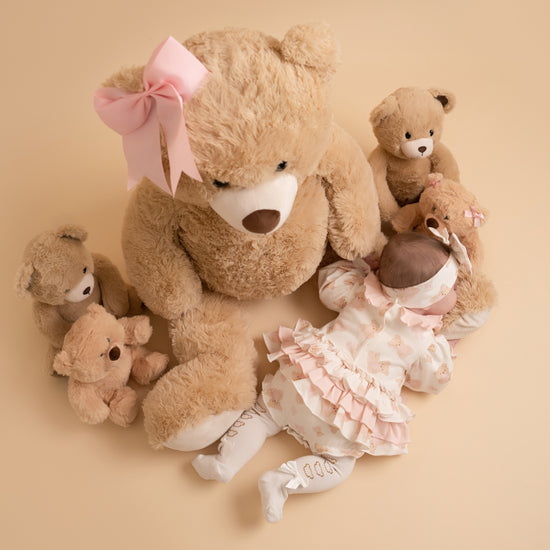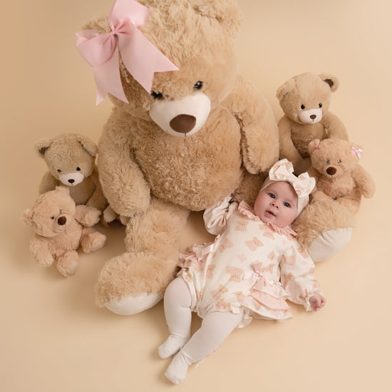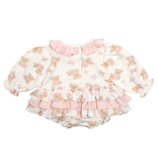 The Georgia Romper features a cute teddy print design with sweat frills, contrast pleated collar, and bow details.