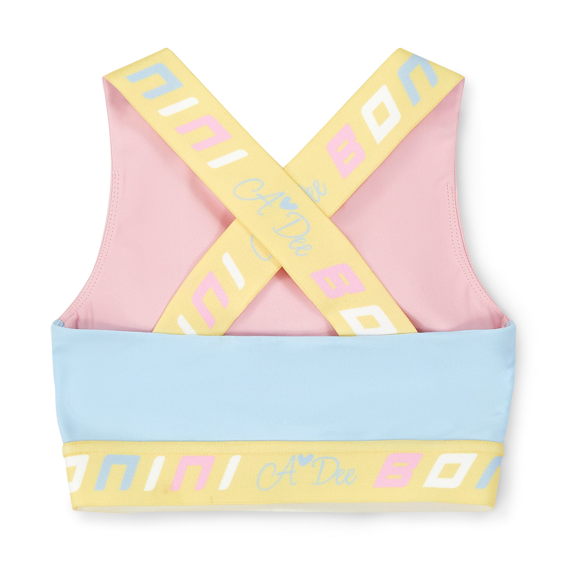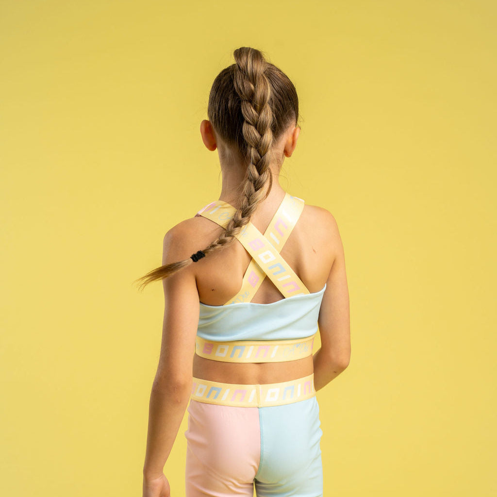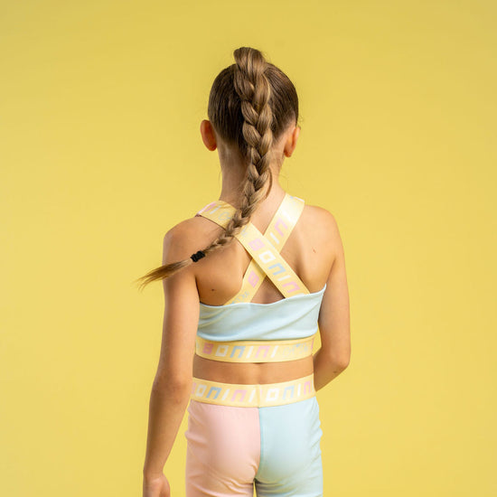 The Flex colour block crop top features logo tape cross back straps and is designs to match pieces within the collection.