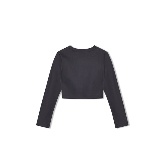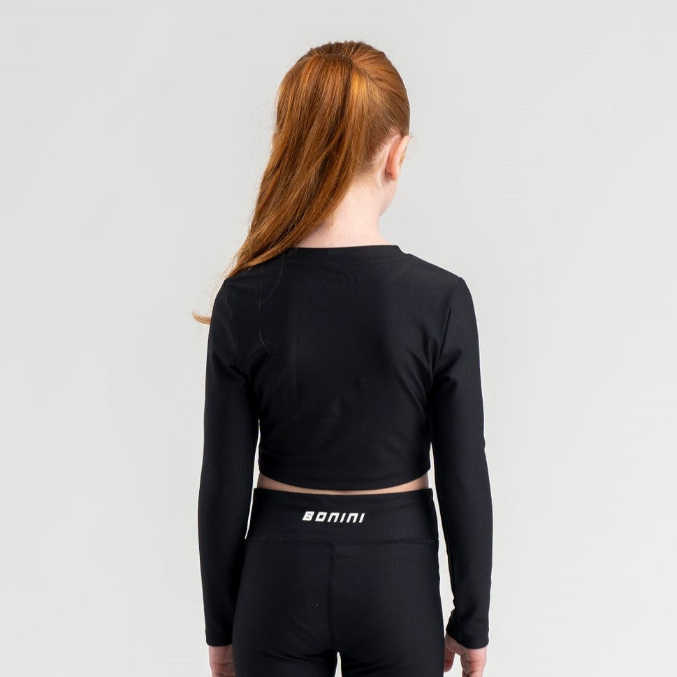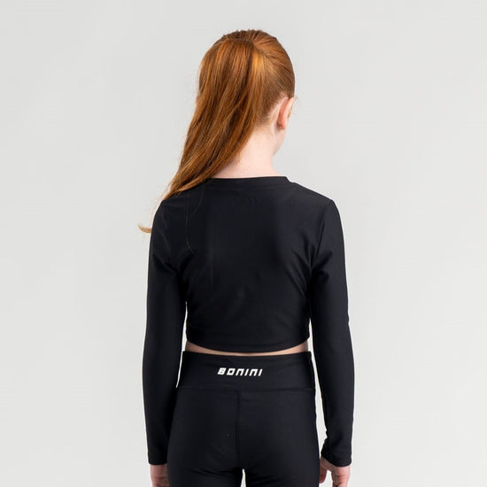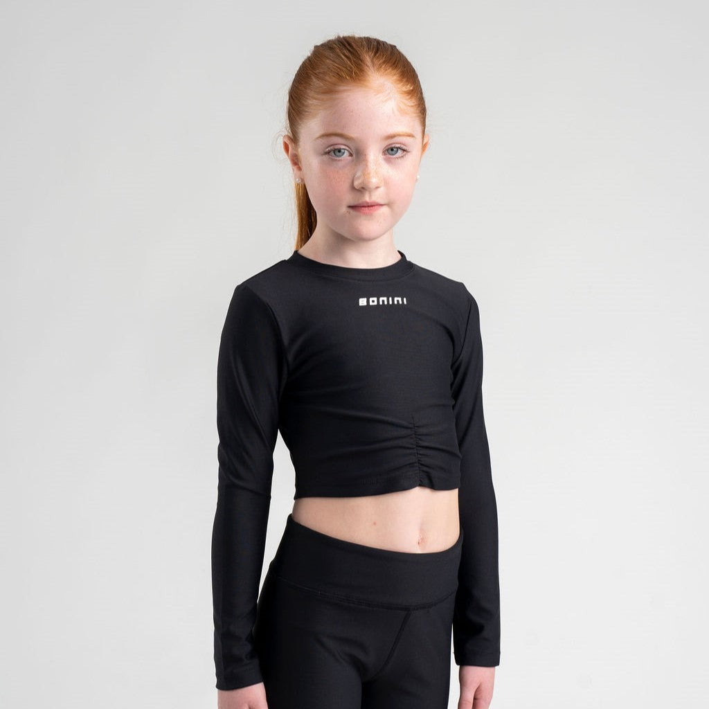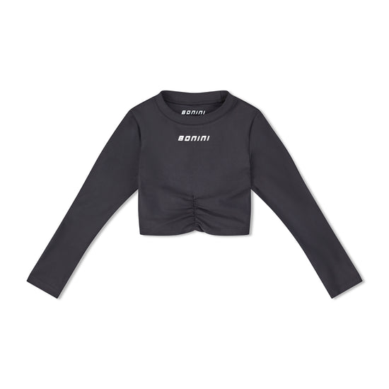 Introducing the Aspire long sleeve crop top. Made from our signature fabric, a blend of polyester and elastane for ultimate stretch and comfort, it features a ruche front design and is finished with Bonini branding on the front.