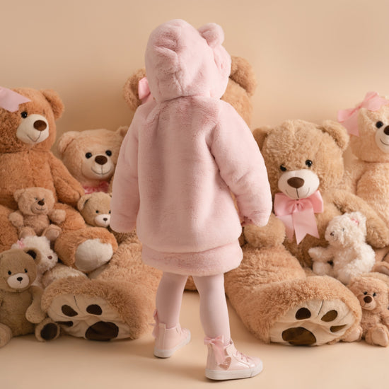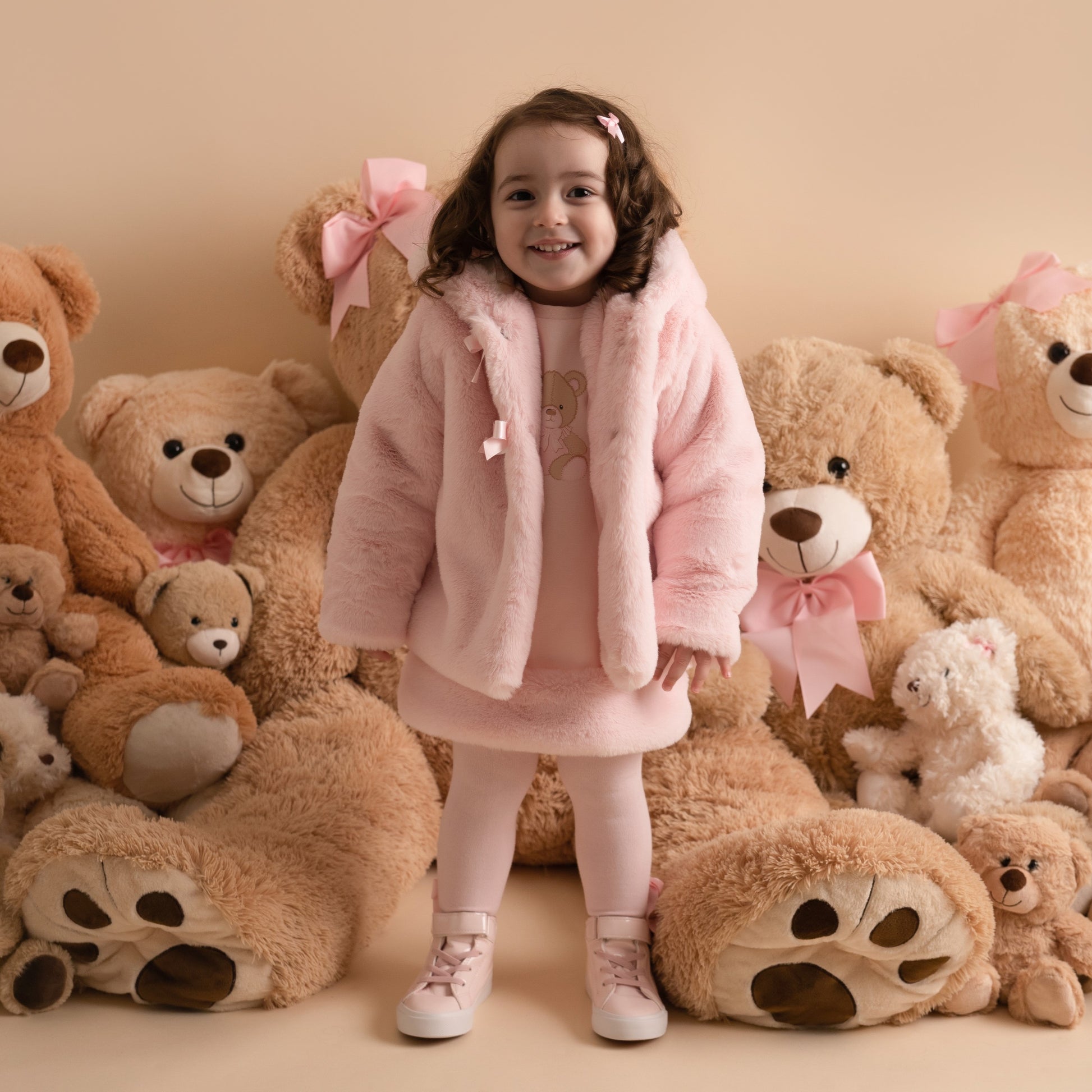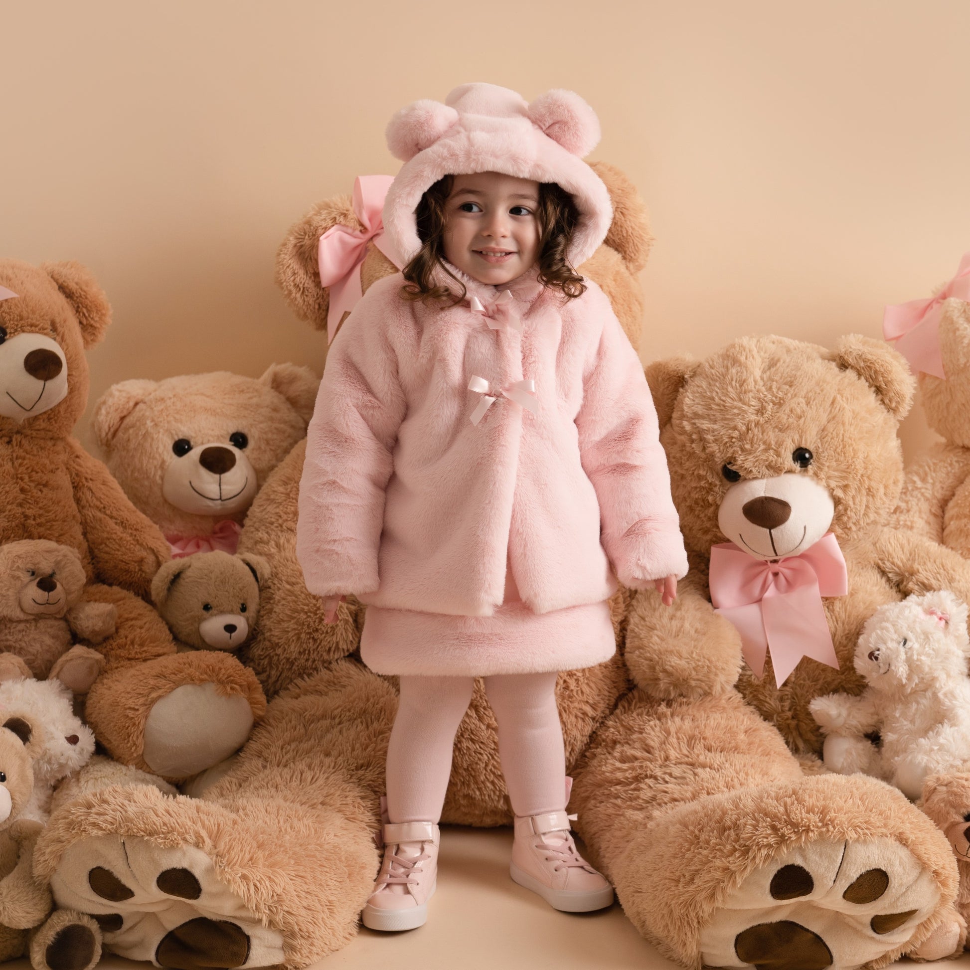 The Gabriella hooded jacket features cute teddy ears on the hood as well as teddy print lining. The bow details on the front add a cute finish to this must-have jacket.
