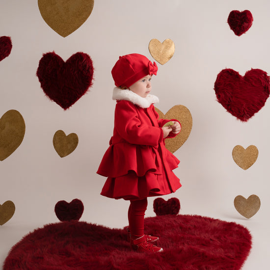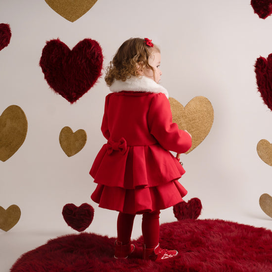 Gorgeous Harper coat made from soft felt it has a double frill hem, front and back bows, diamante logo on one arm and white fur collar. Finished with a button front opening and satin lining. Comes with matching beret.