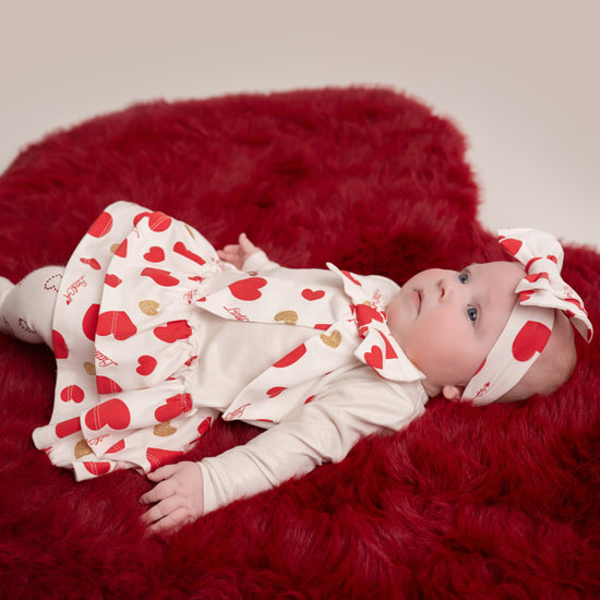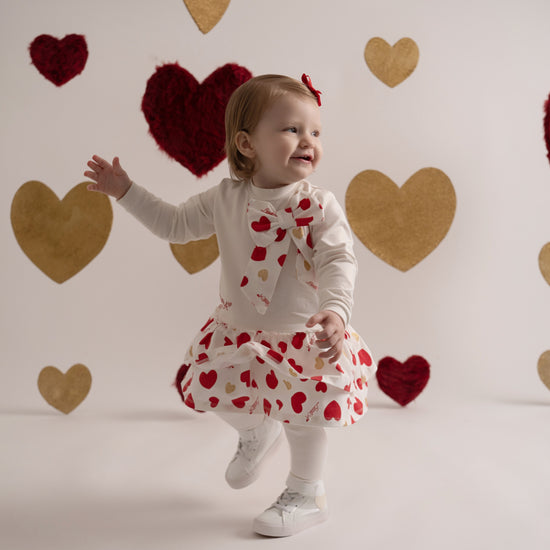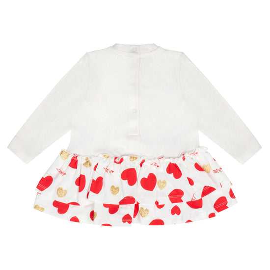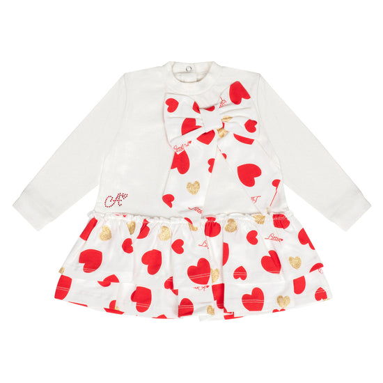 This white Hannah dress is made from soft jersey with a gold sparkle finish featuring a beautiful heart red and gold print on the bow applique and double frill hem. Finished with a diamante logo and back popper fastening.