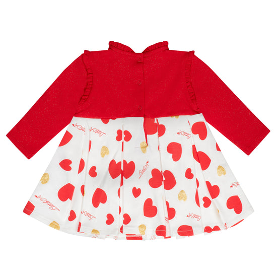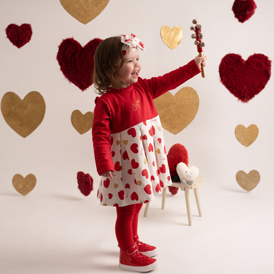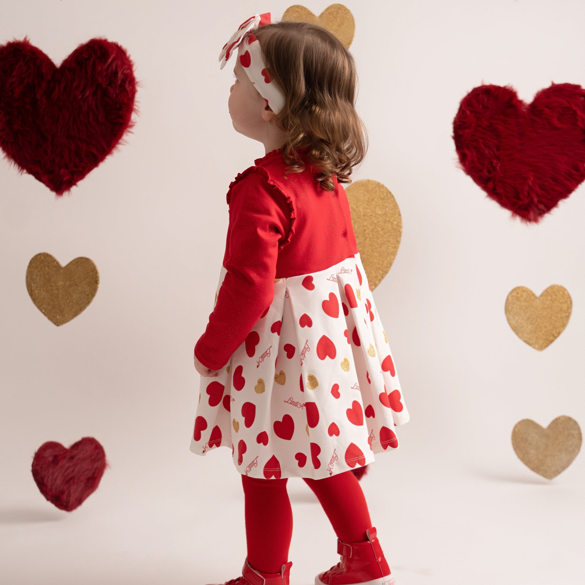 This red Hannah dress has a red top with a gold sparkle finish and diamante logo. It has a full pleated skirt featuring a beautiful heart red and gold print and is finished with back button fastening.