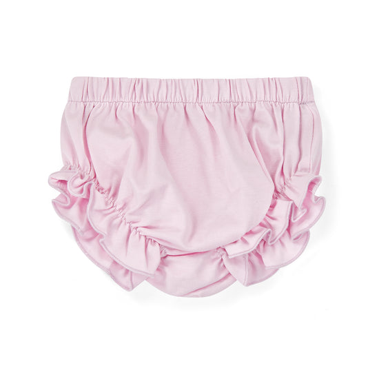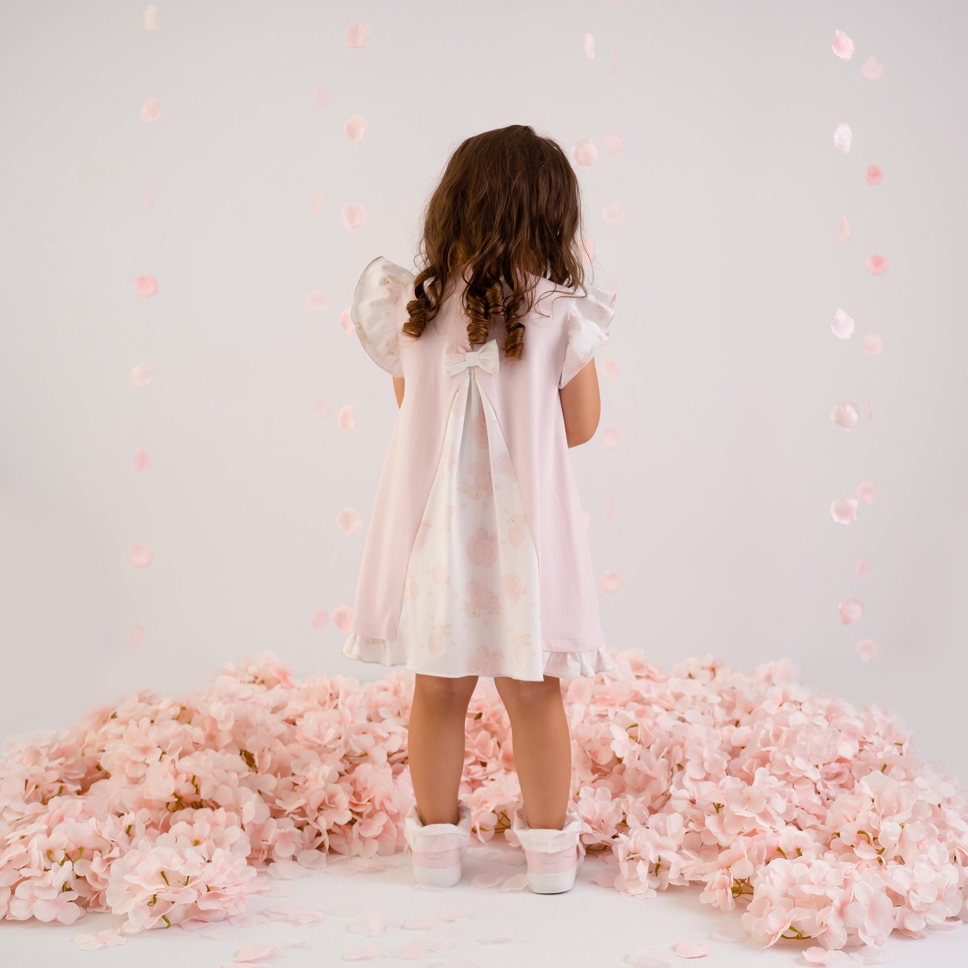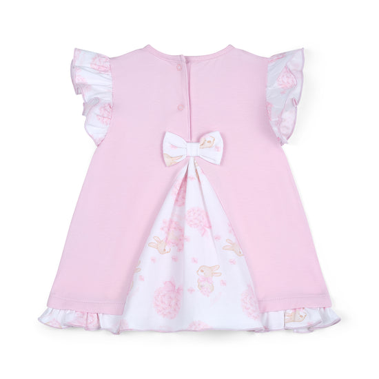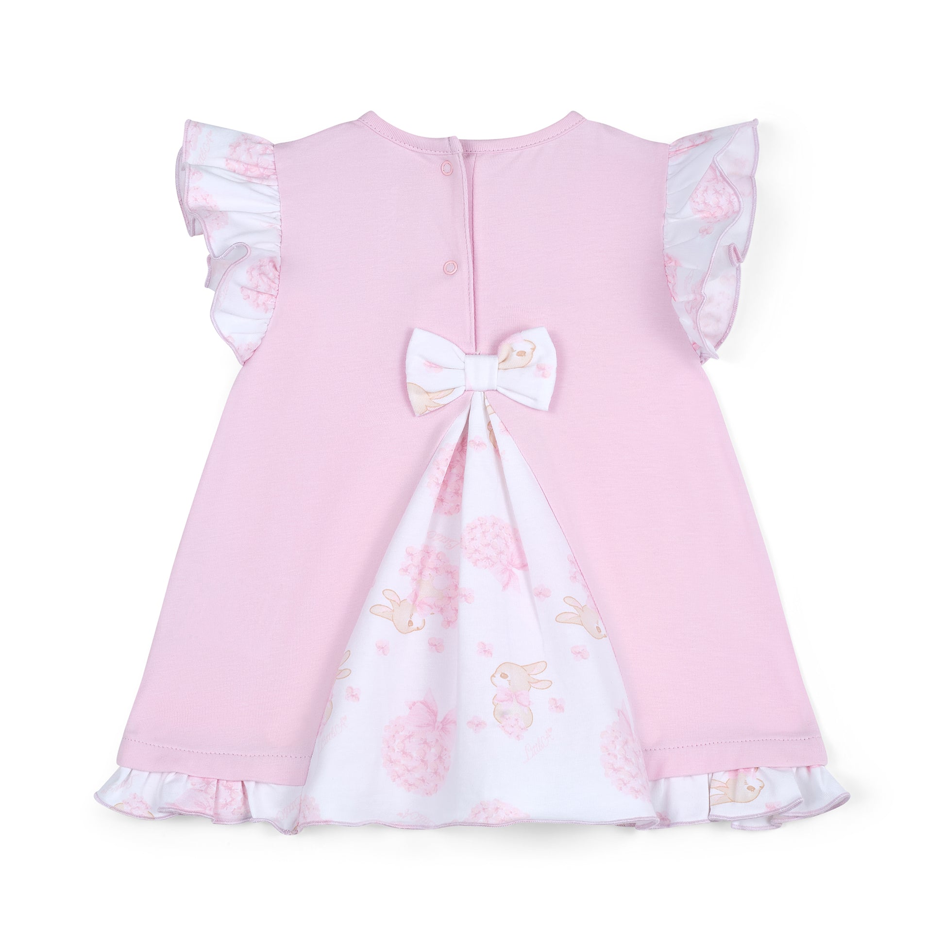 The Amy A-line dress features a hydrangea print with a contrast seersucker stripe back insert, cute frills and bow detail, complete with matching knickers.