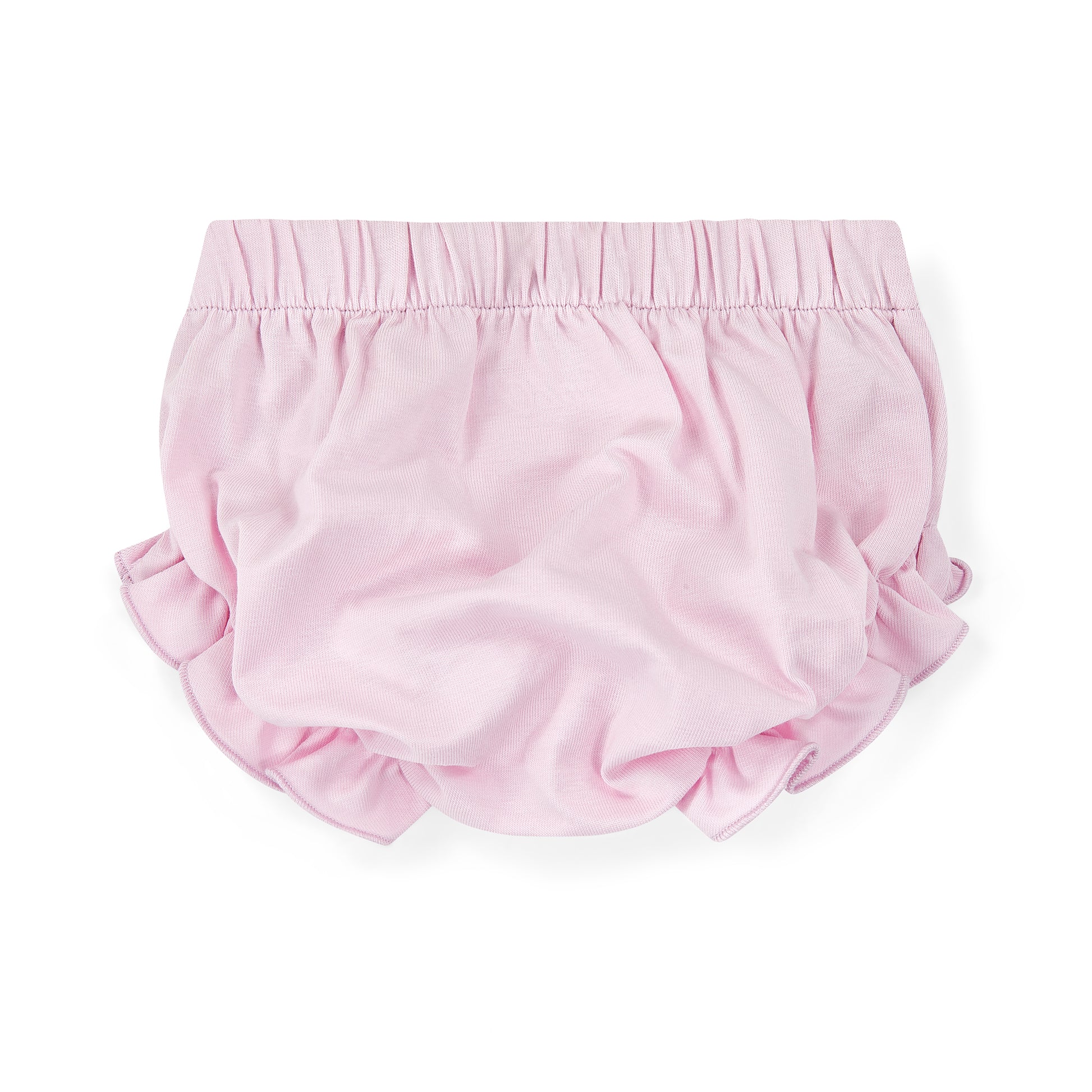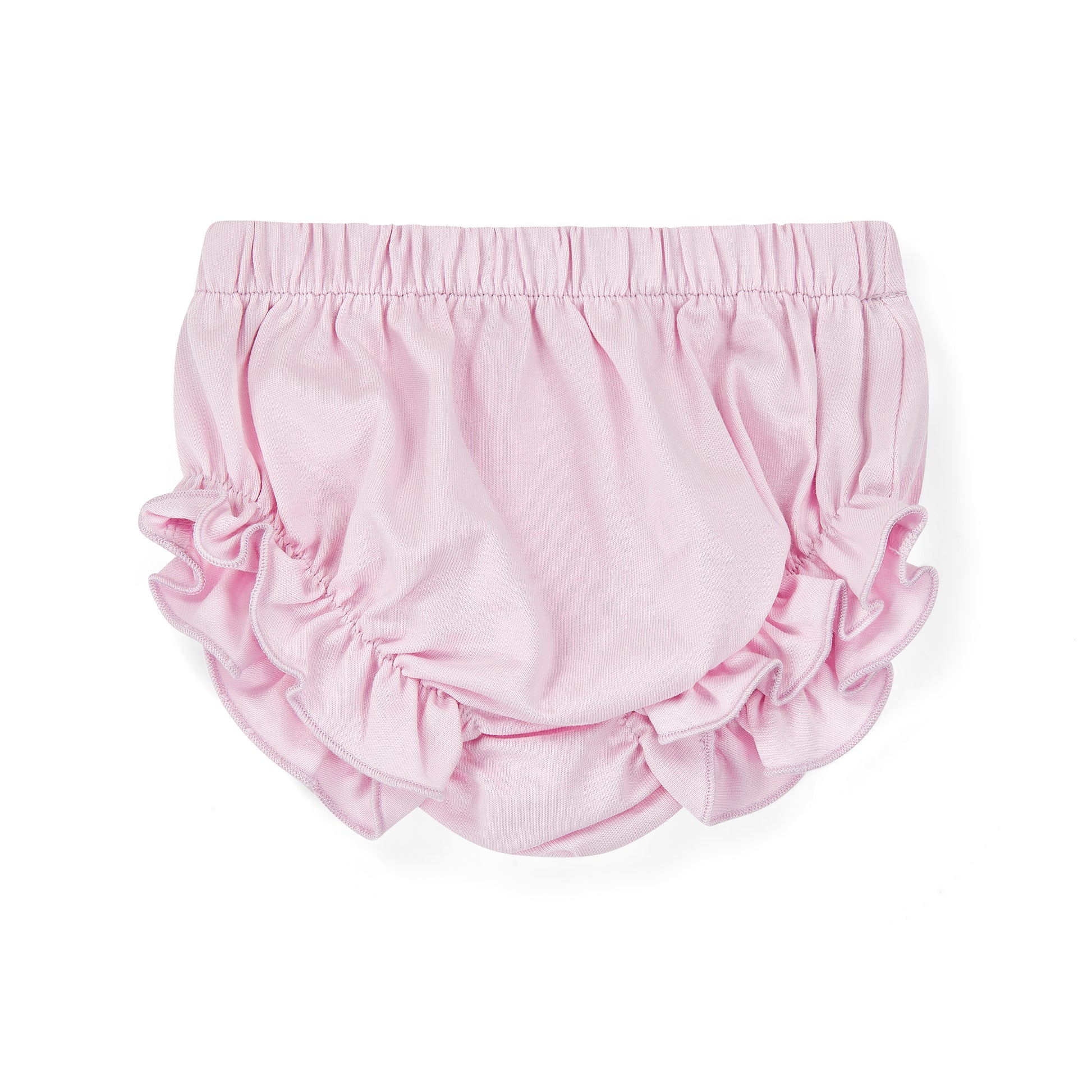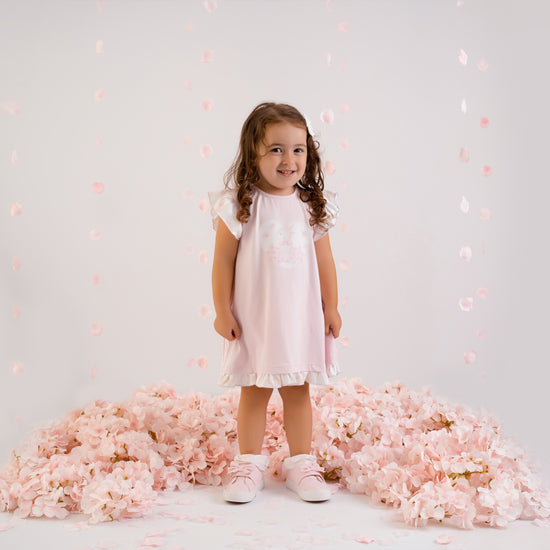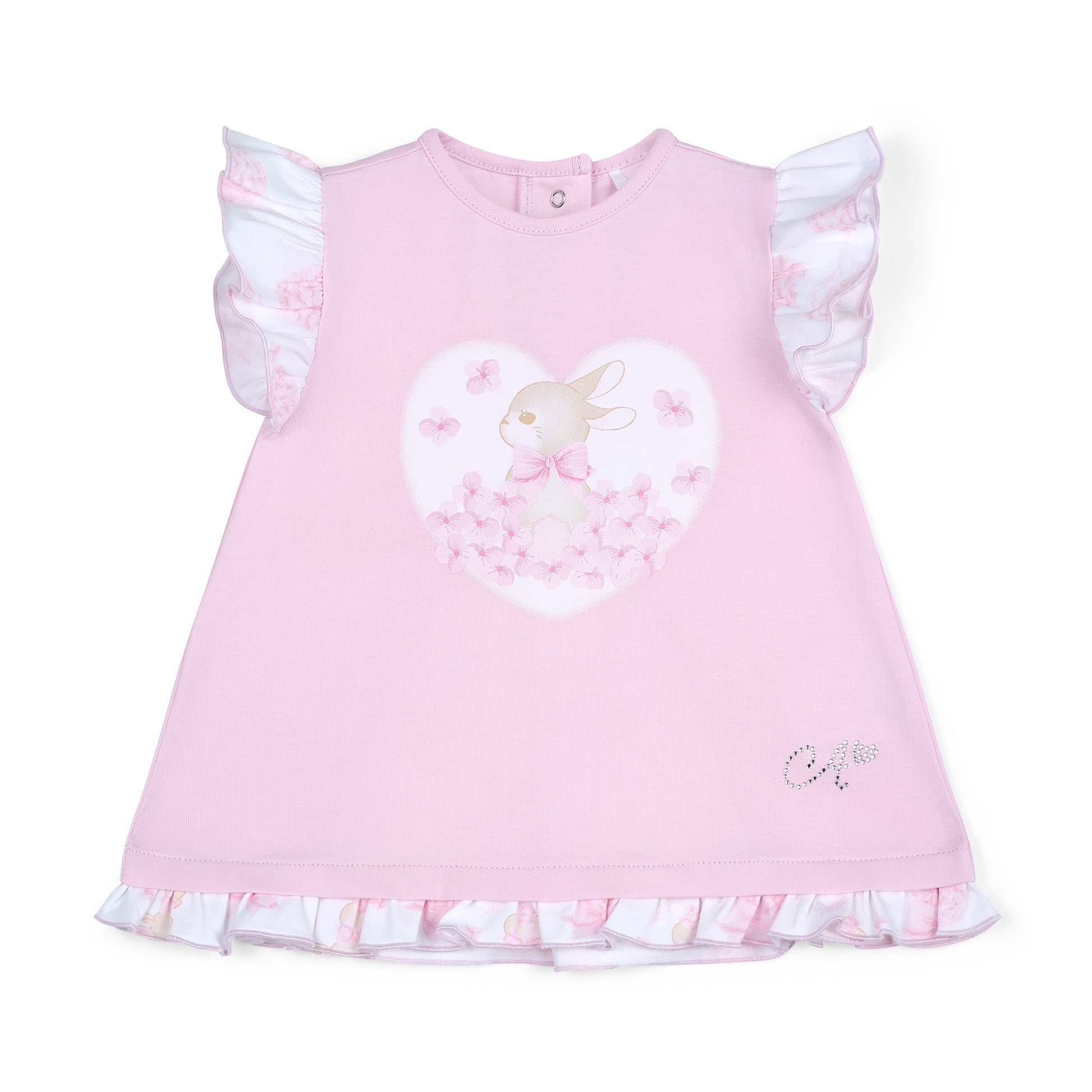 The Amy A-line dress features a hydrangea print with a contrast seersucker stripe back insert, cute frills and bow detail, complete with matching knickers.