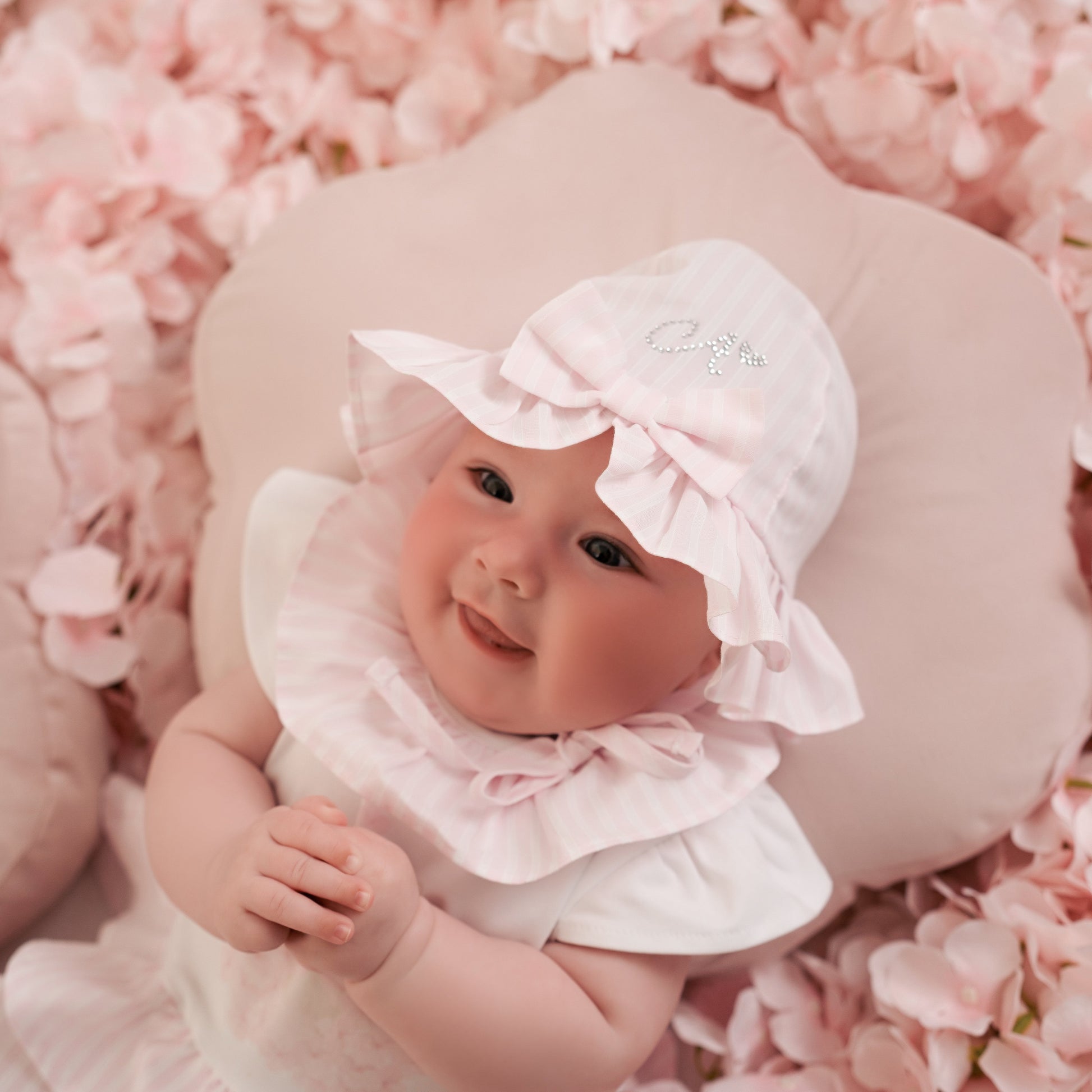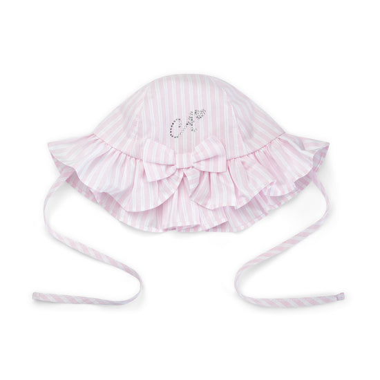 The Aurora sun hat is perfect for summer, featuring stripe seersucker with a cute bow and diamante branding