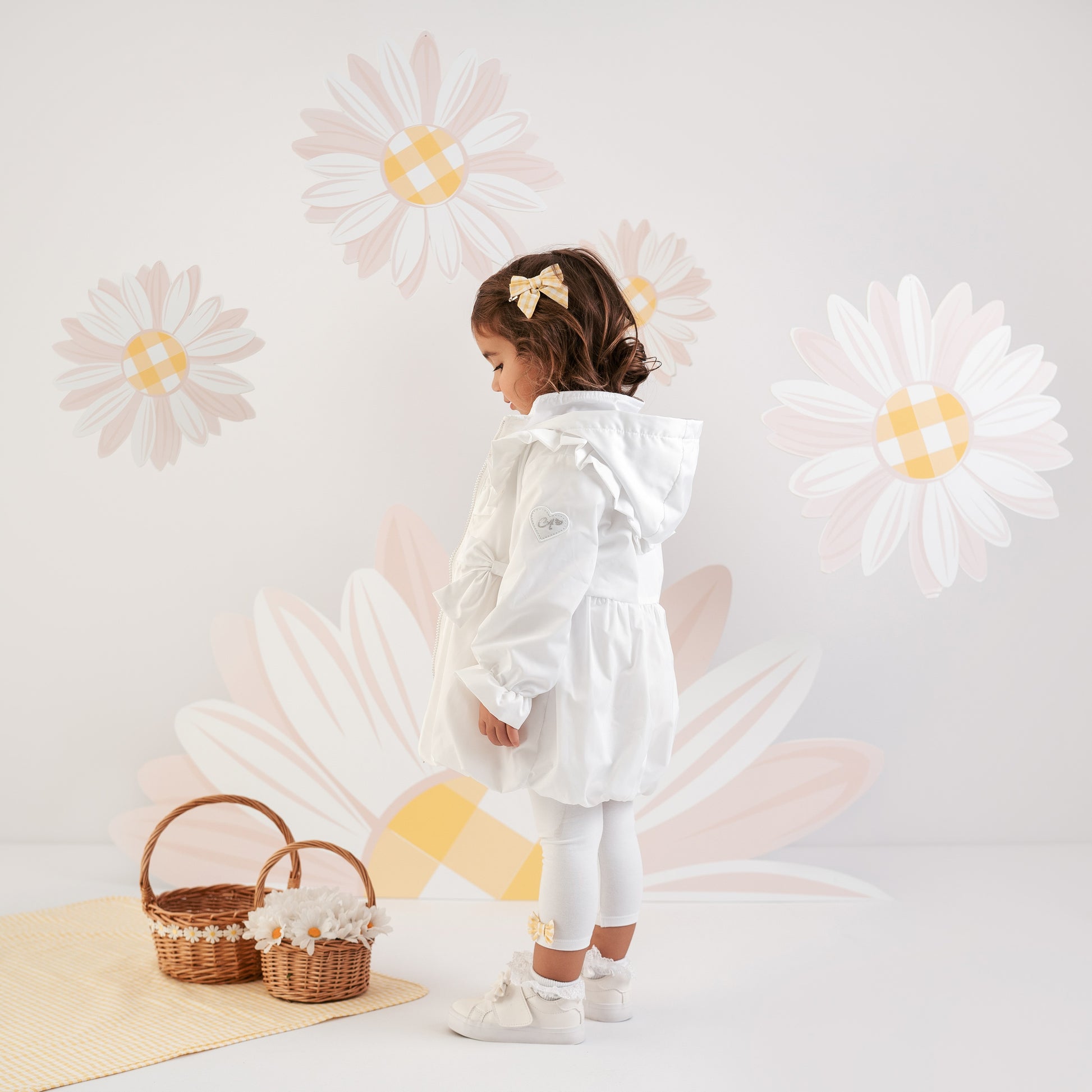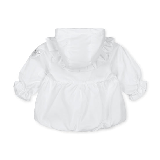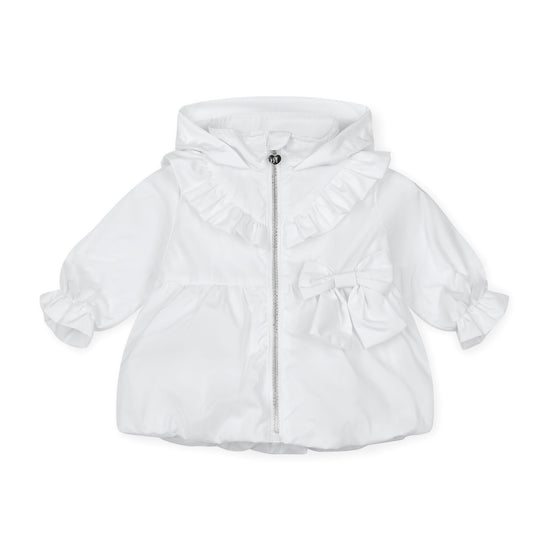 Introducing the Bobbie puffball hooded jacket with frill details on the front and back as well as bow detail, diamante zip and diamante logo badge.