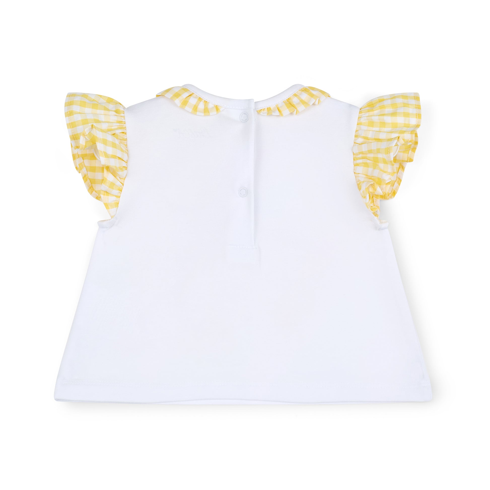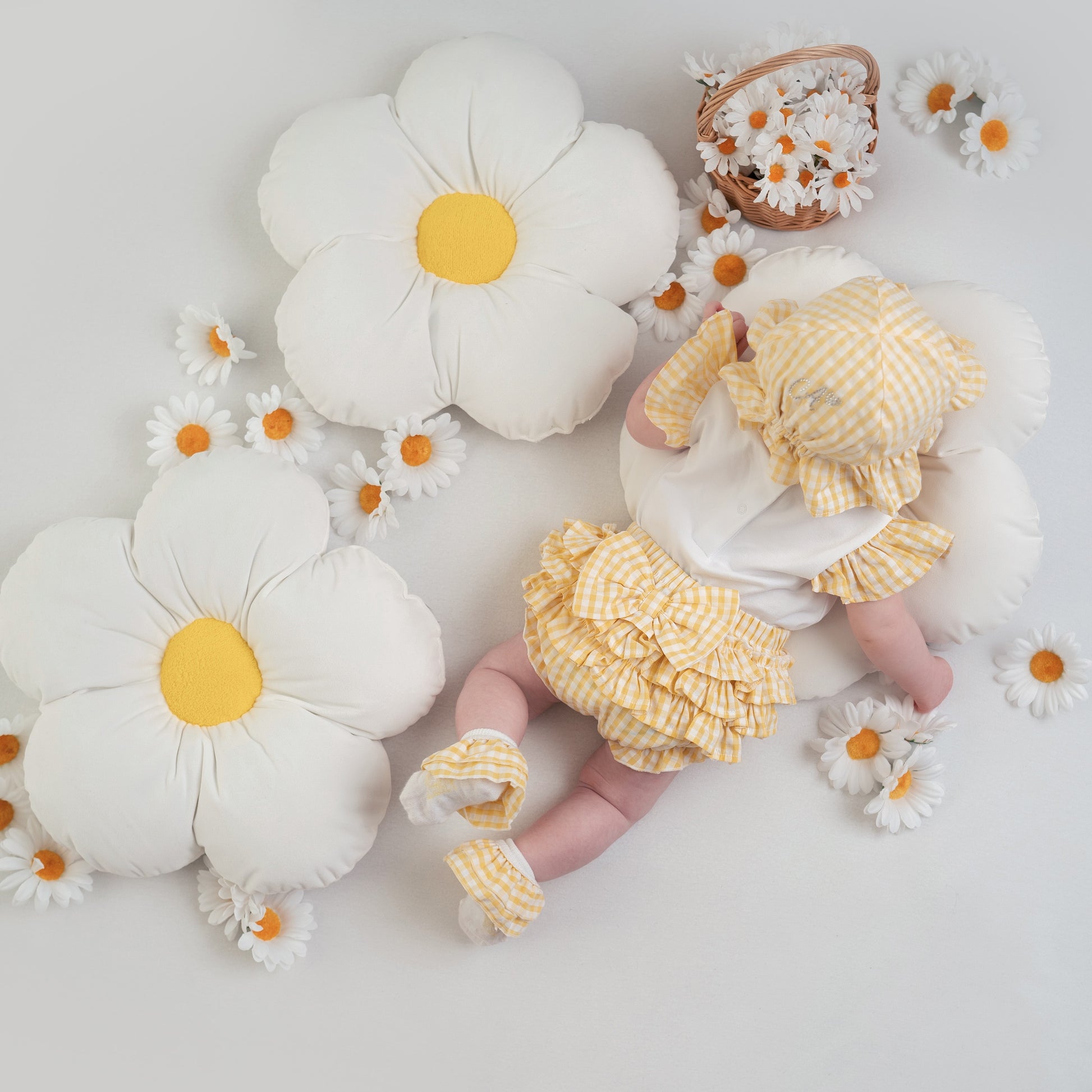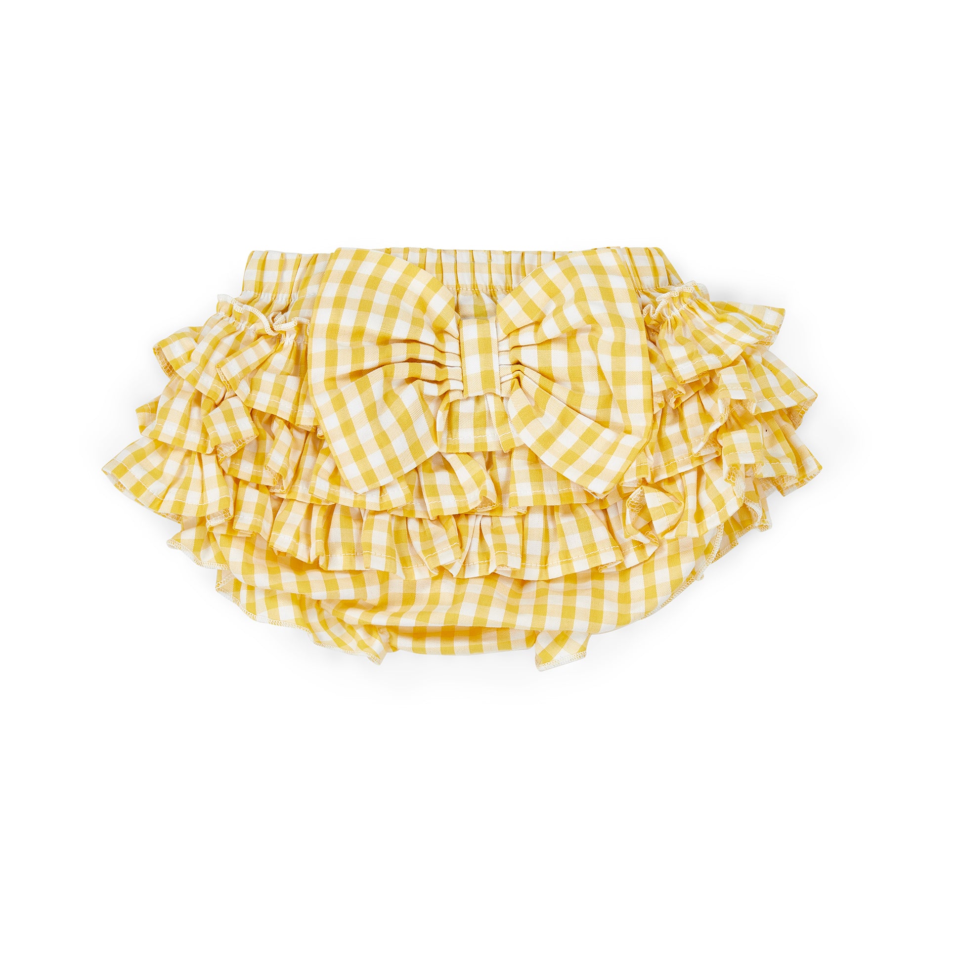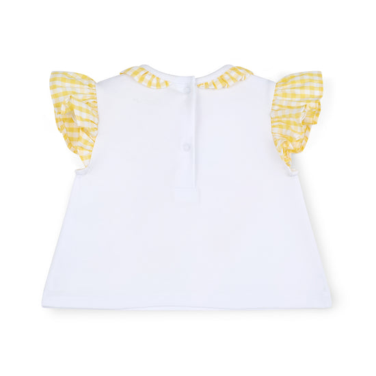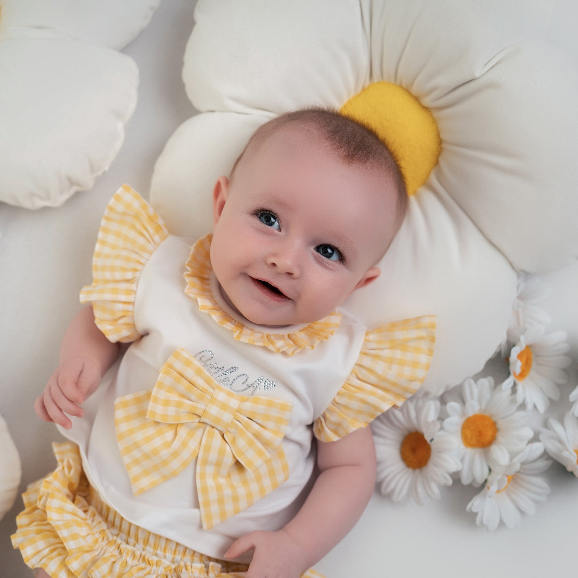 The Avery two piece jam pant set includes a cotton jersey t-shirt with gingham seersucker frills and bow to match the frill gingham seersucker pants.