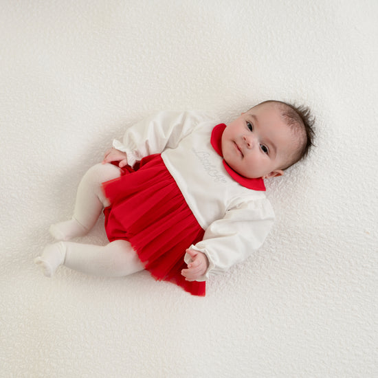 The Kimberly romper features the sweetest tulle skirt and red peter pan collar. Finished with diamante branding.