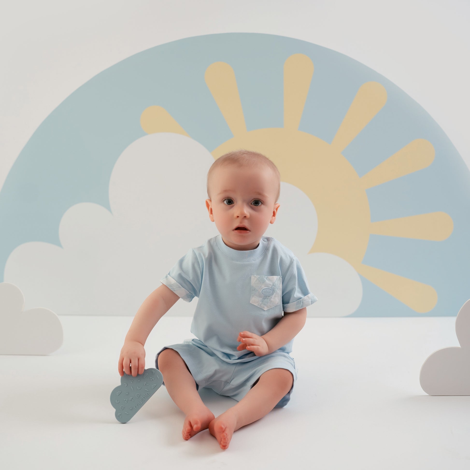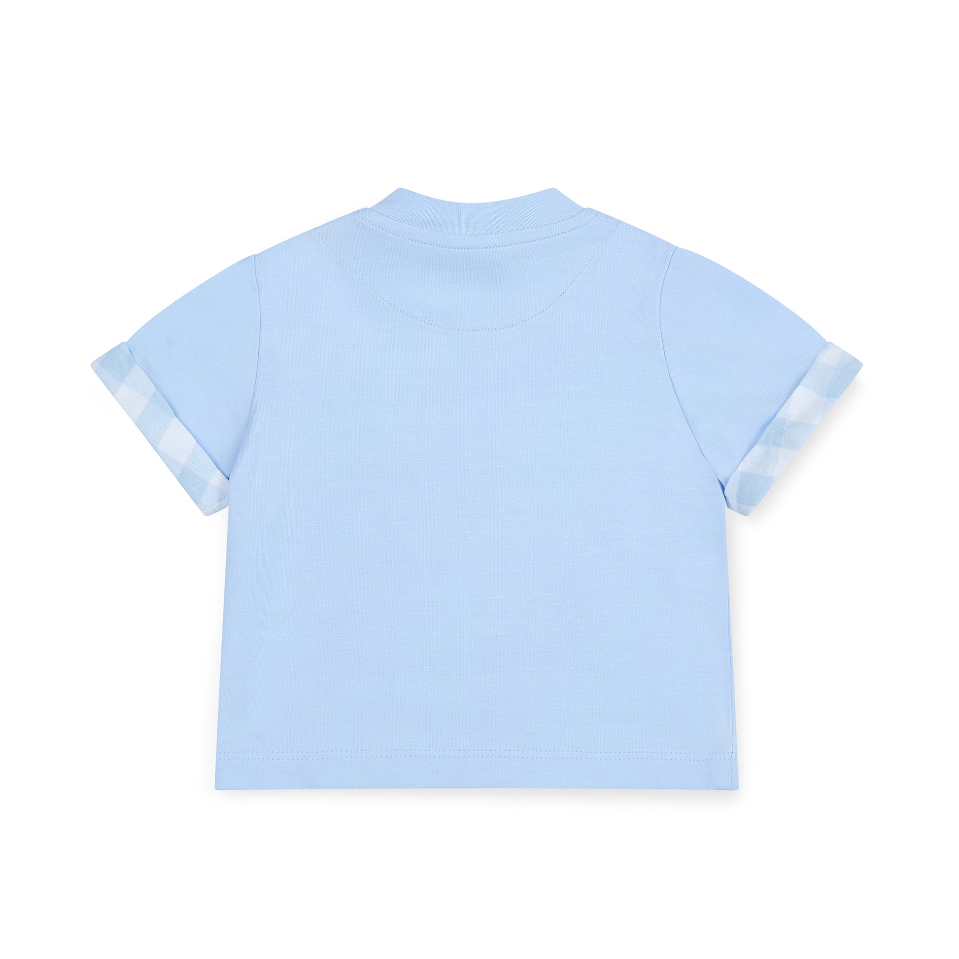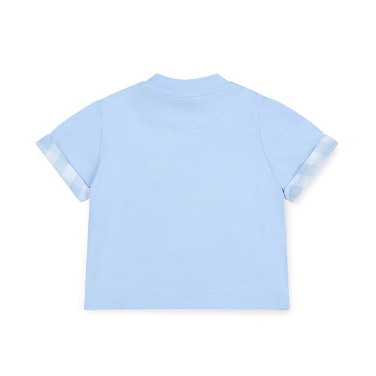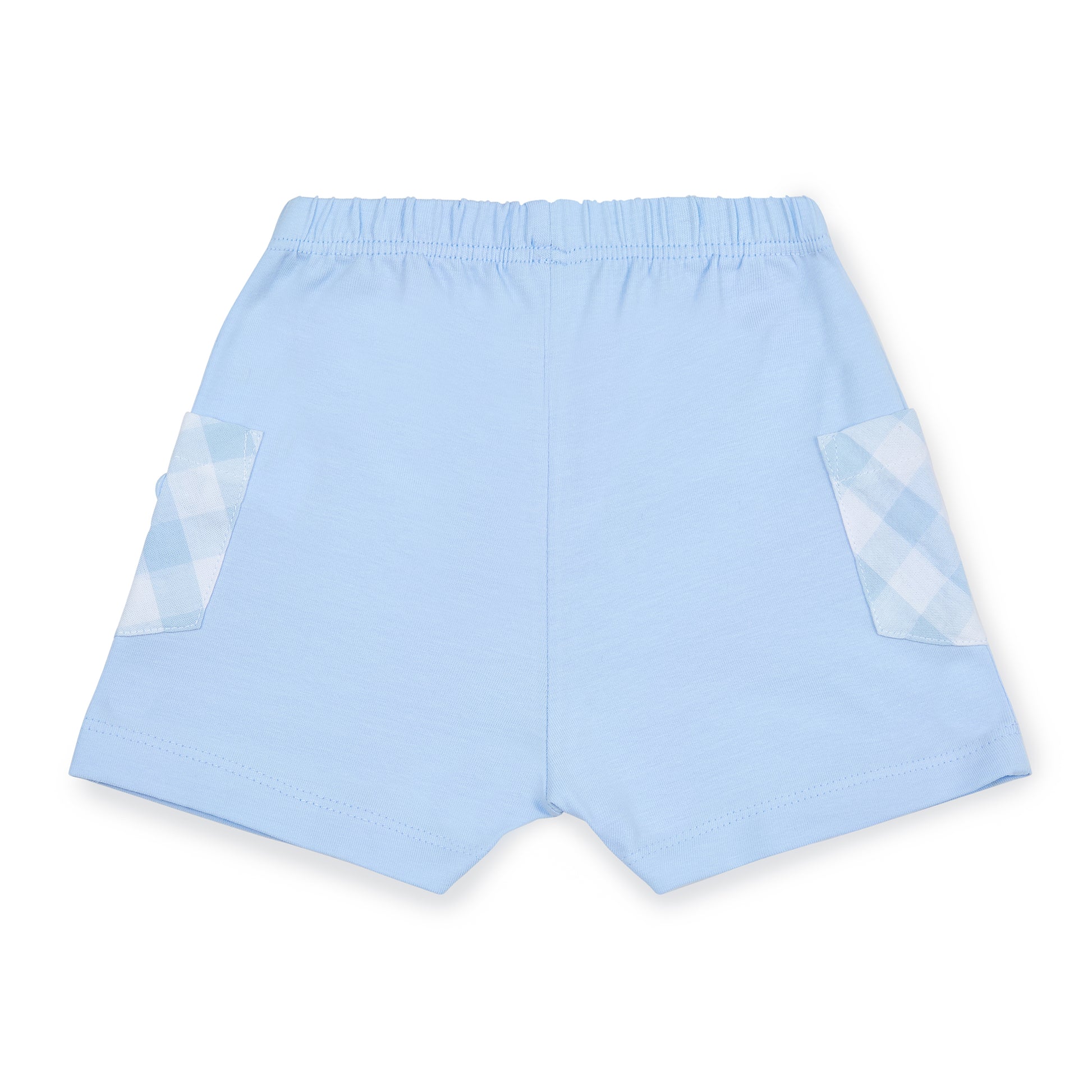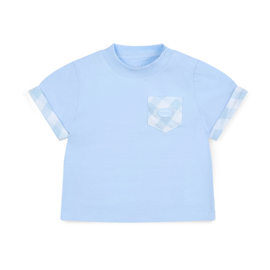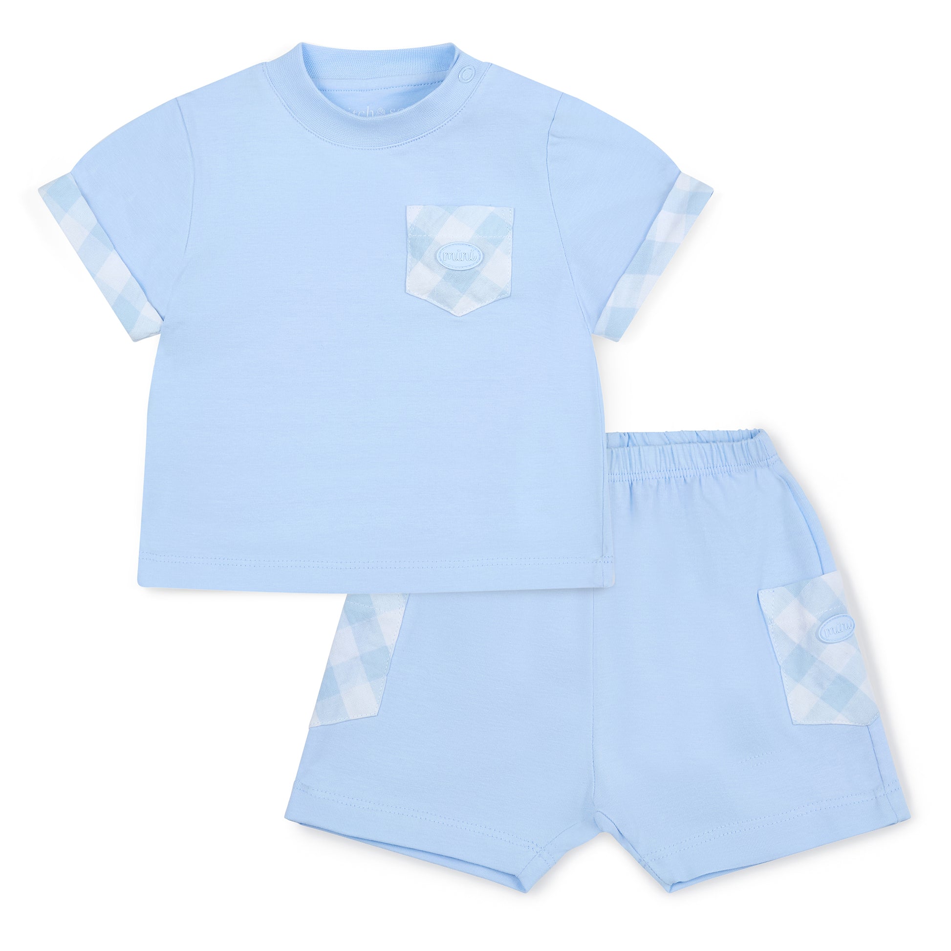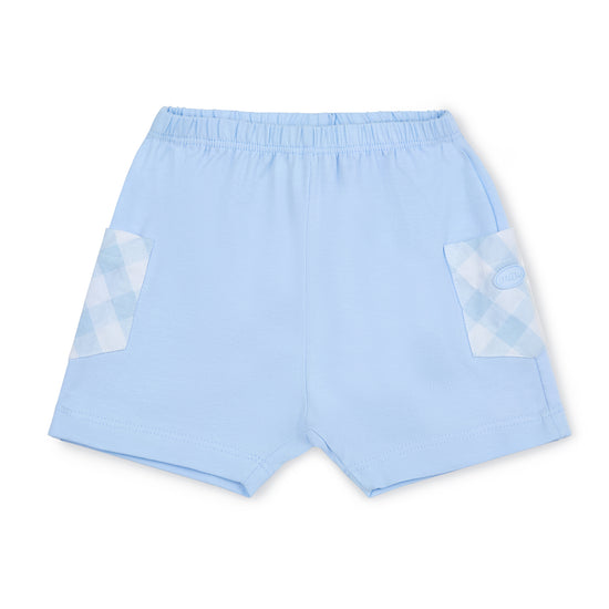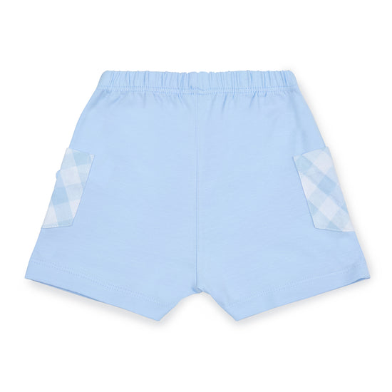 The Ethan two piece set features contrast gingham pocket on the front of the t-shirt and is paired with pale blue shorts with contrast gingham pockets and a rubber logo badge on both.