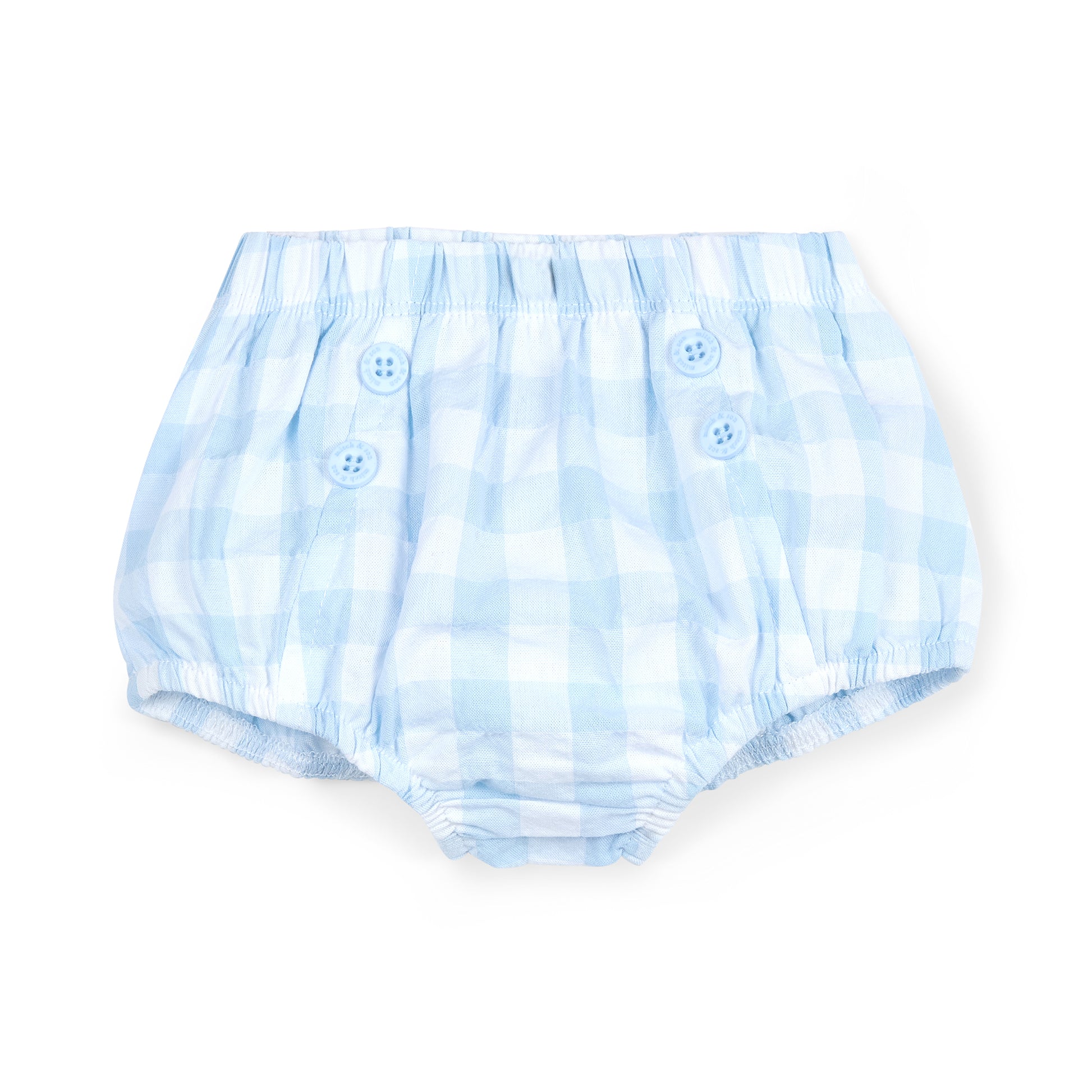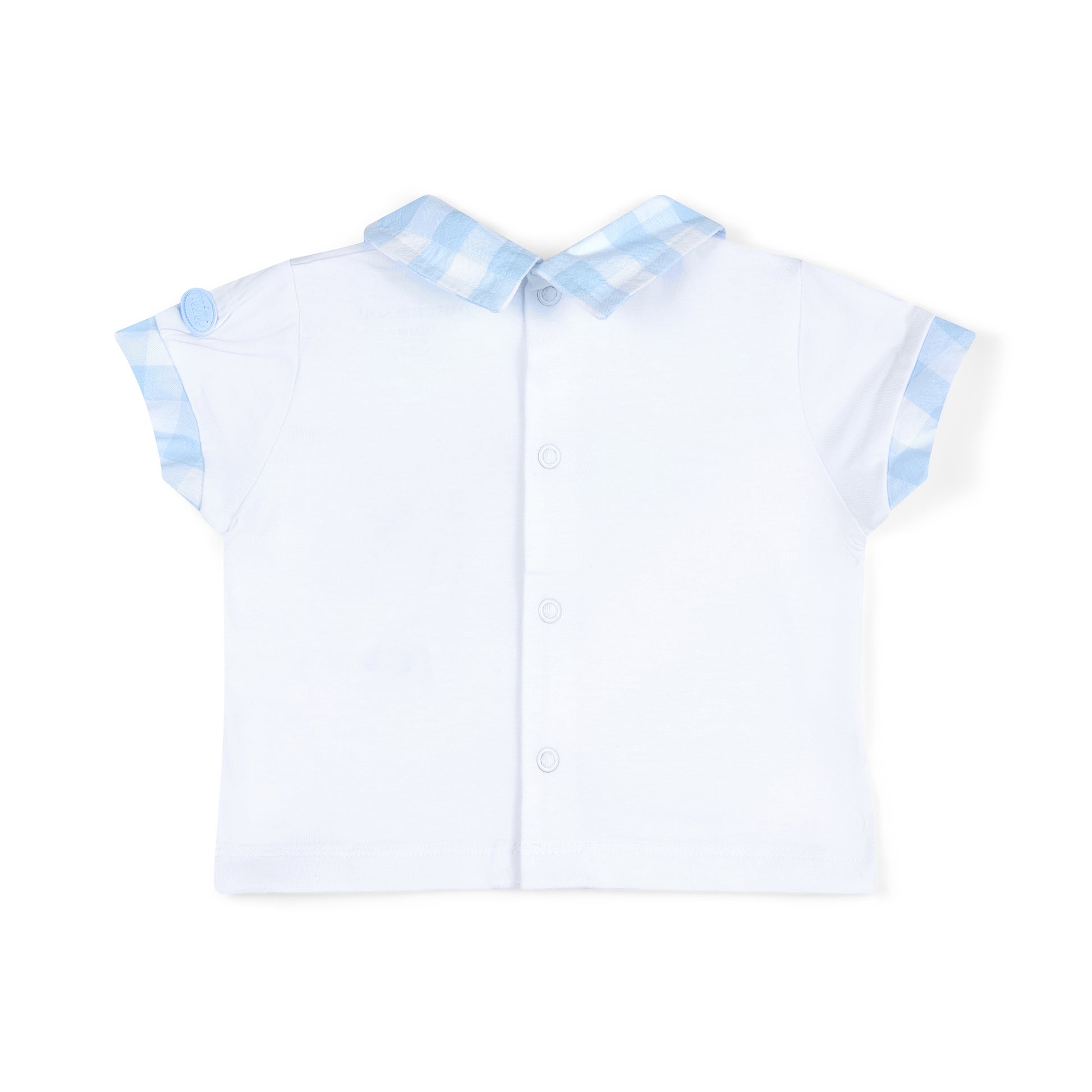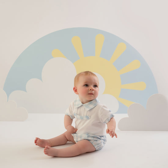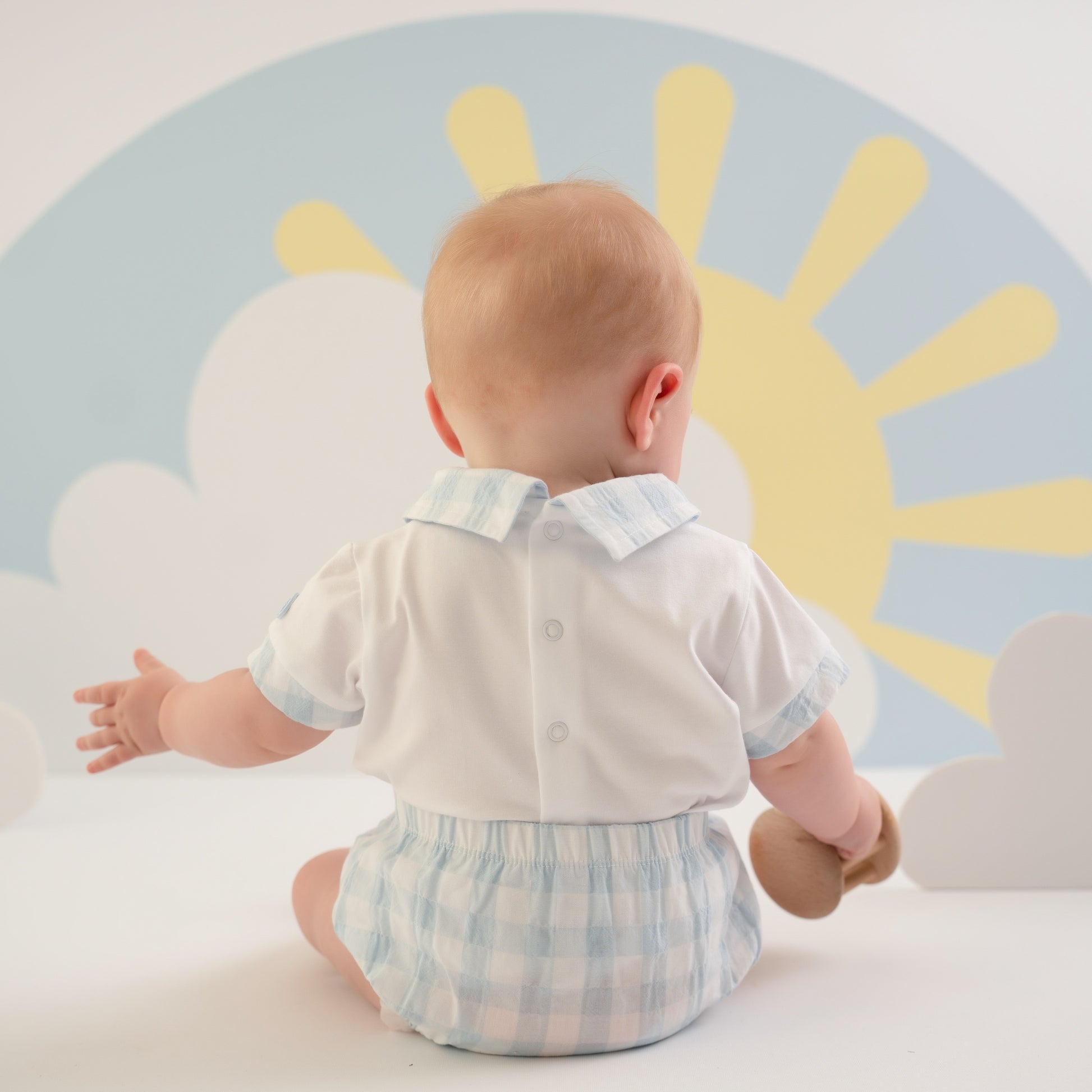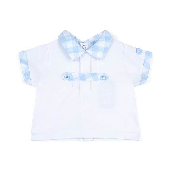The Ezra two piece set features pintuck detail on the front of polo top and contrast gingham collar and cuffs and is paired with contrast gingham pants with button details.