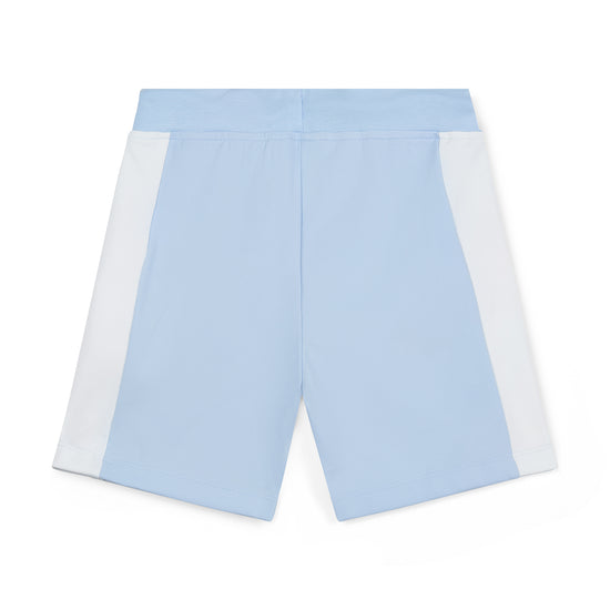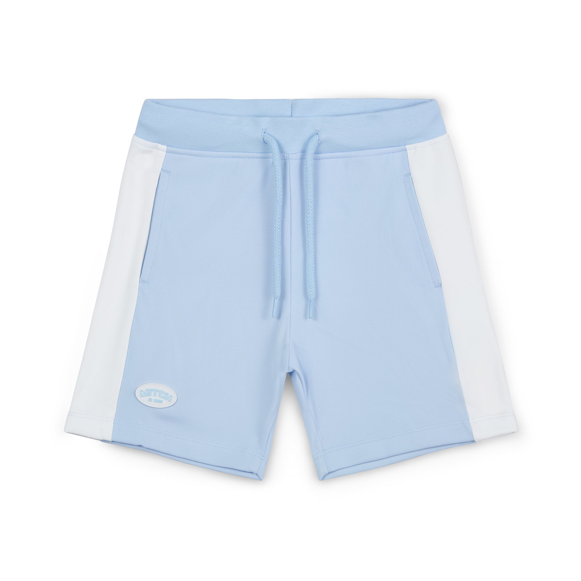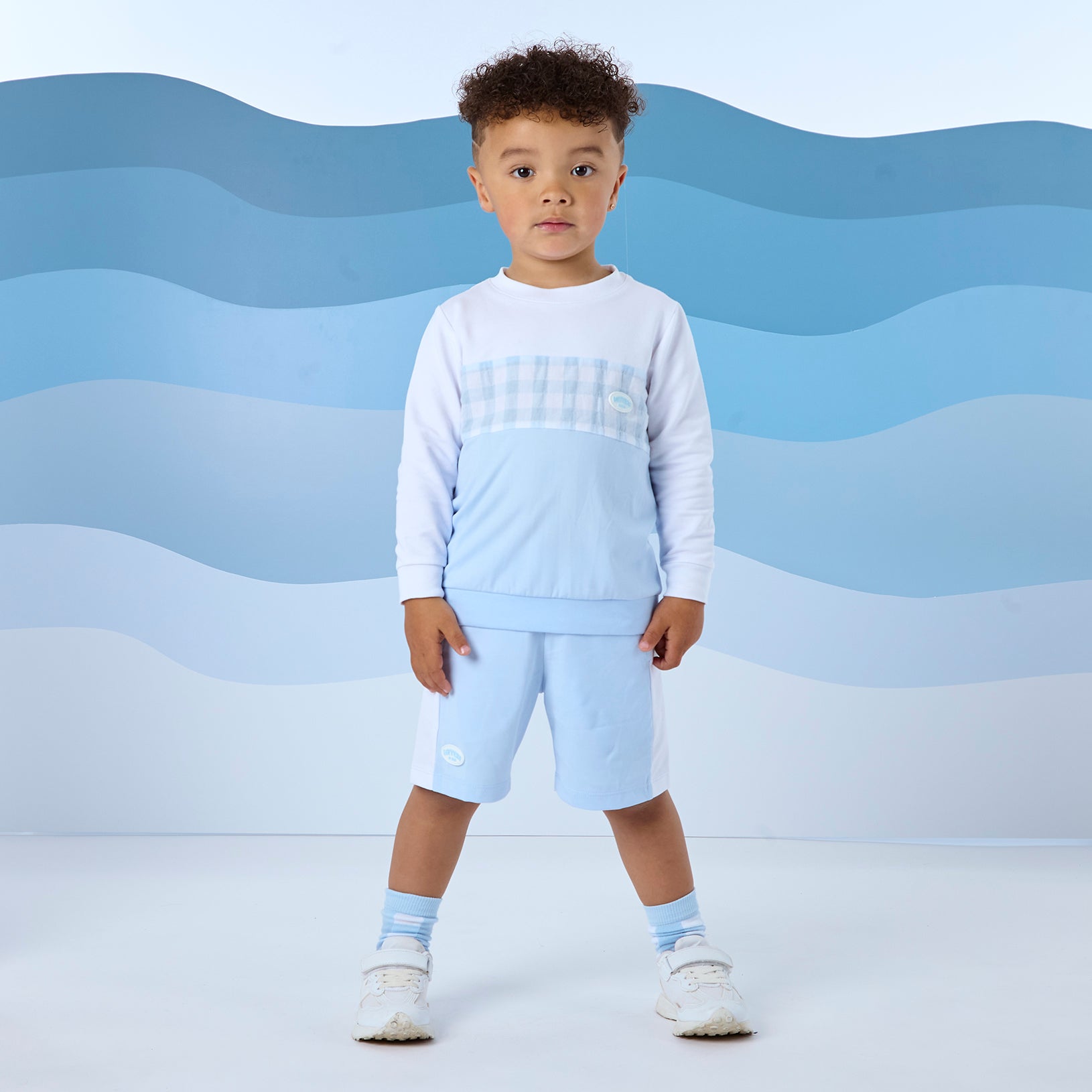 The Finley sweatshirt set features a contrast gingham panel and is paired with matching shorts with contrast white side panels.