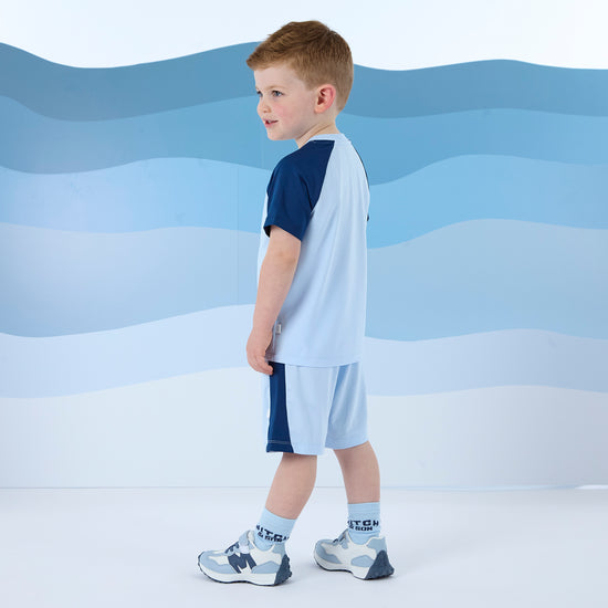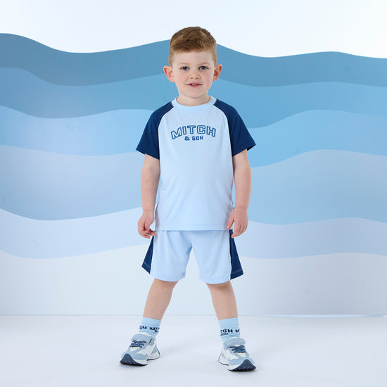 The Felix set includes a jersey raglan t-shirt with contrast sleeves and raised rubber artwork paired with matching shorts with contrast side panels.