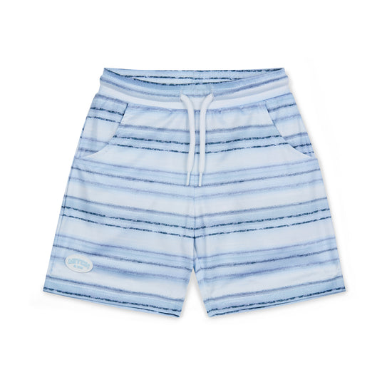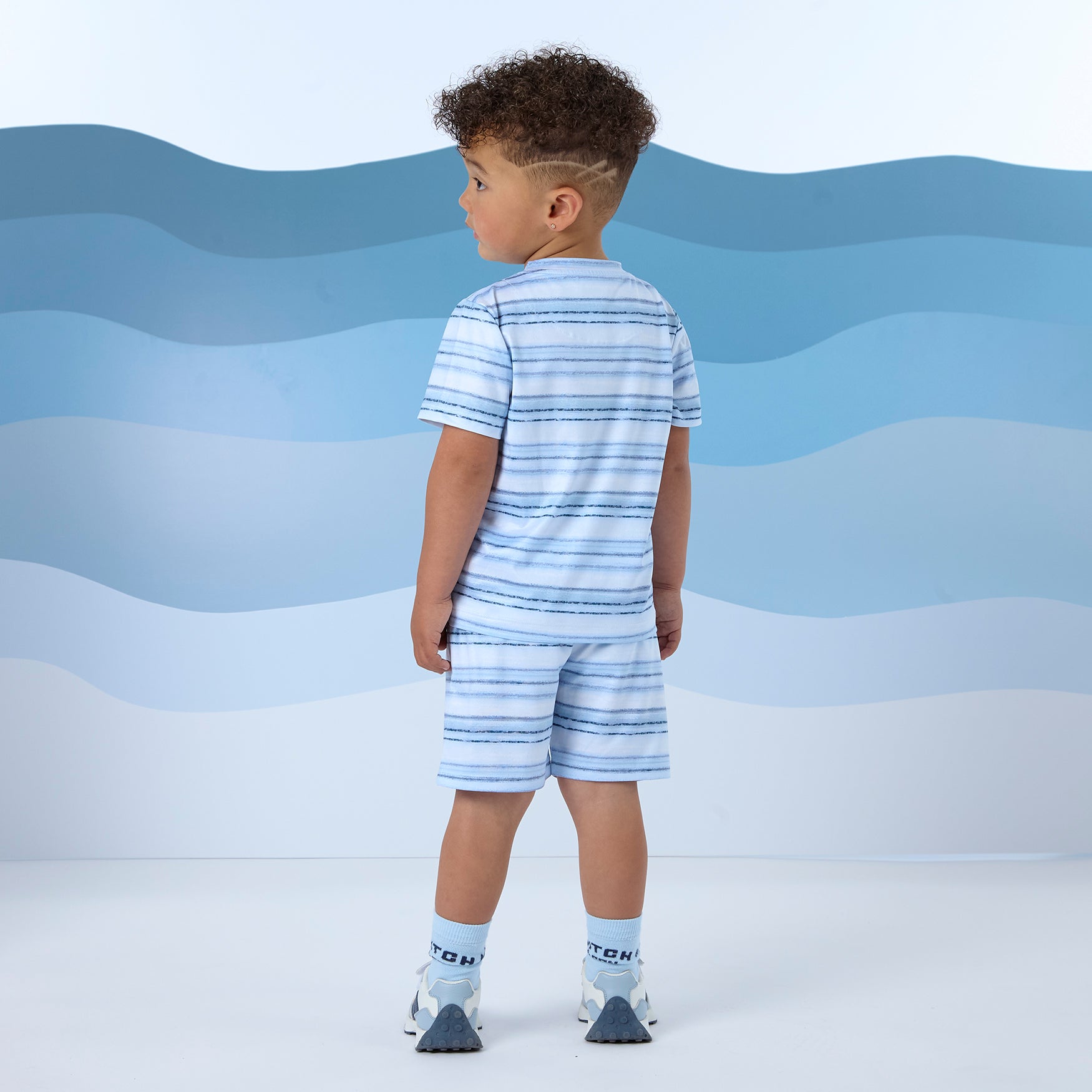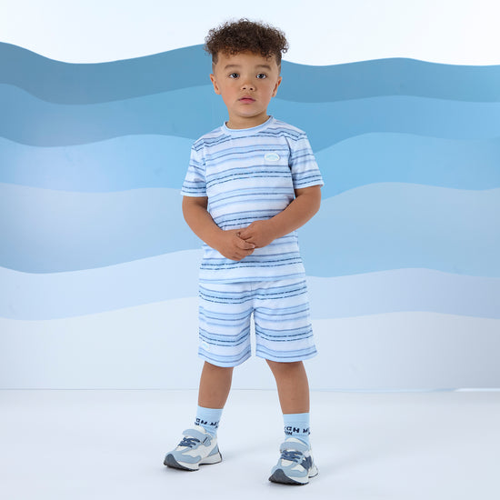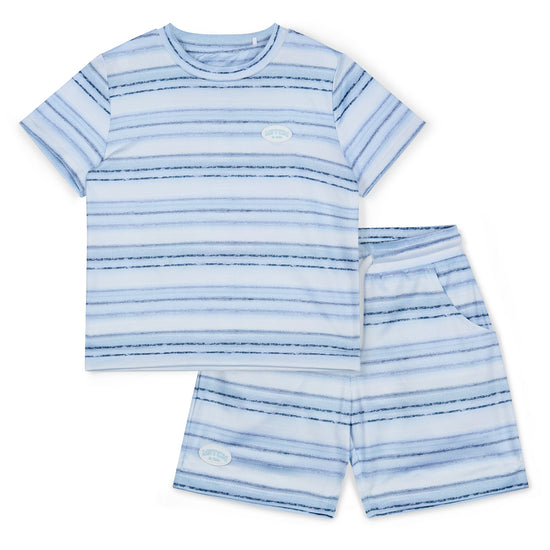 This jersey shorts set features a stripe design and includes rubber logo badge on both.