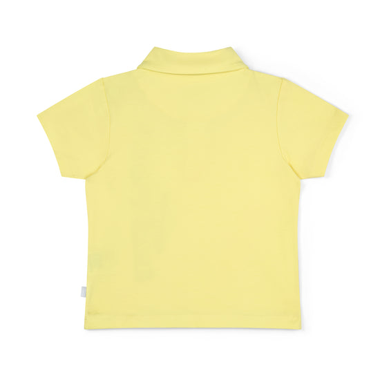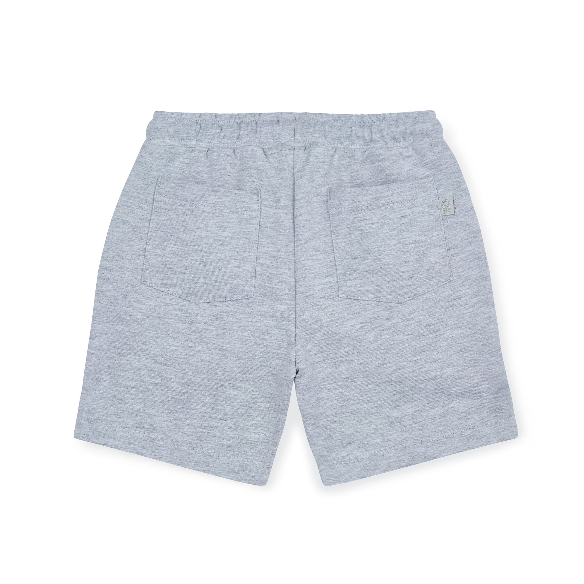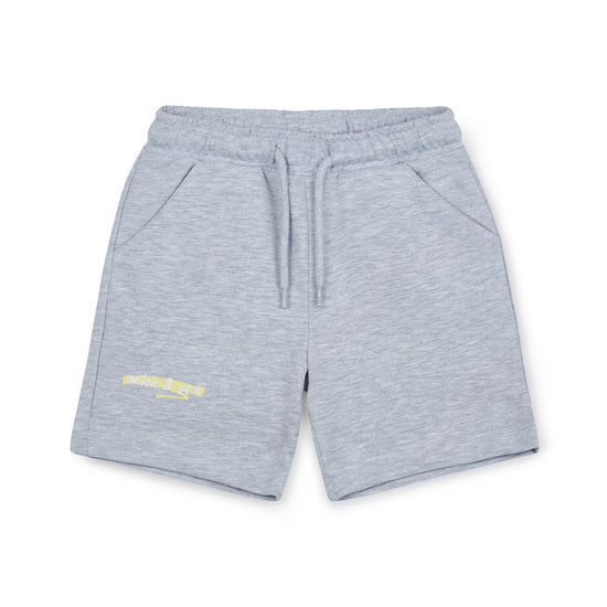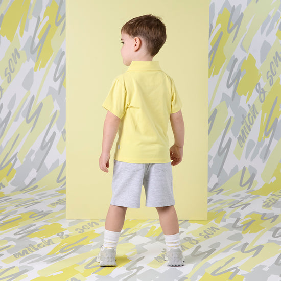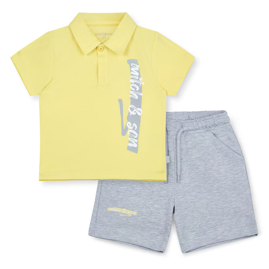 The Gael cotton jersey polo top features printed logo art work on the front and is paired with grey sweat shorts with a printed logo.