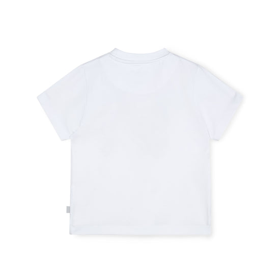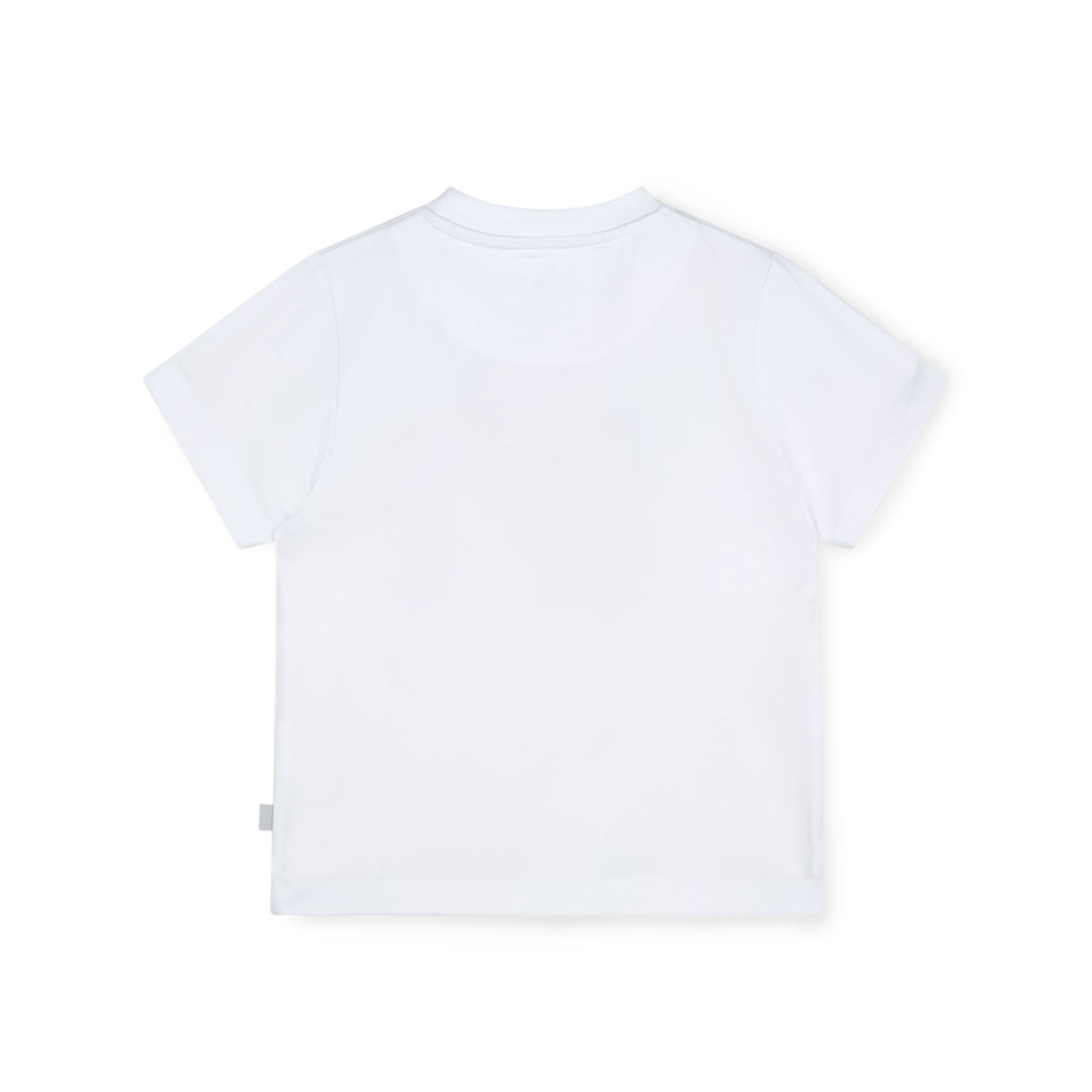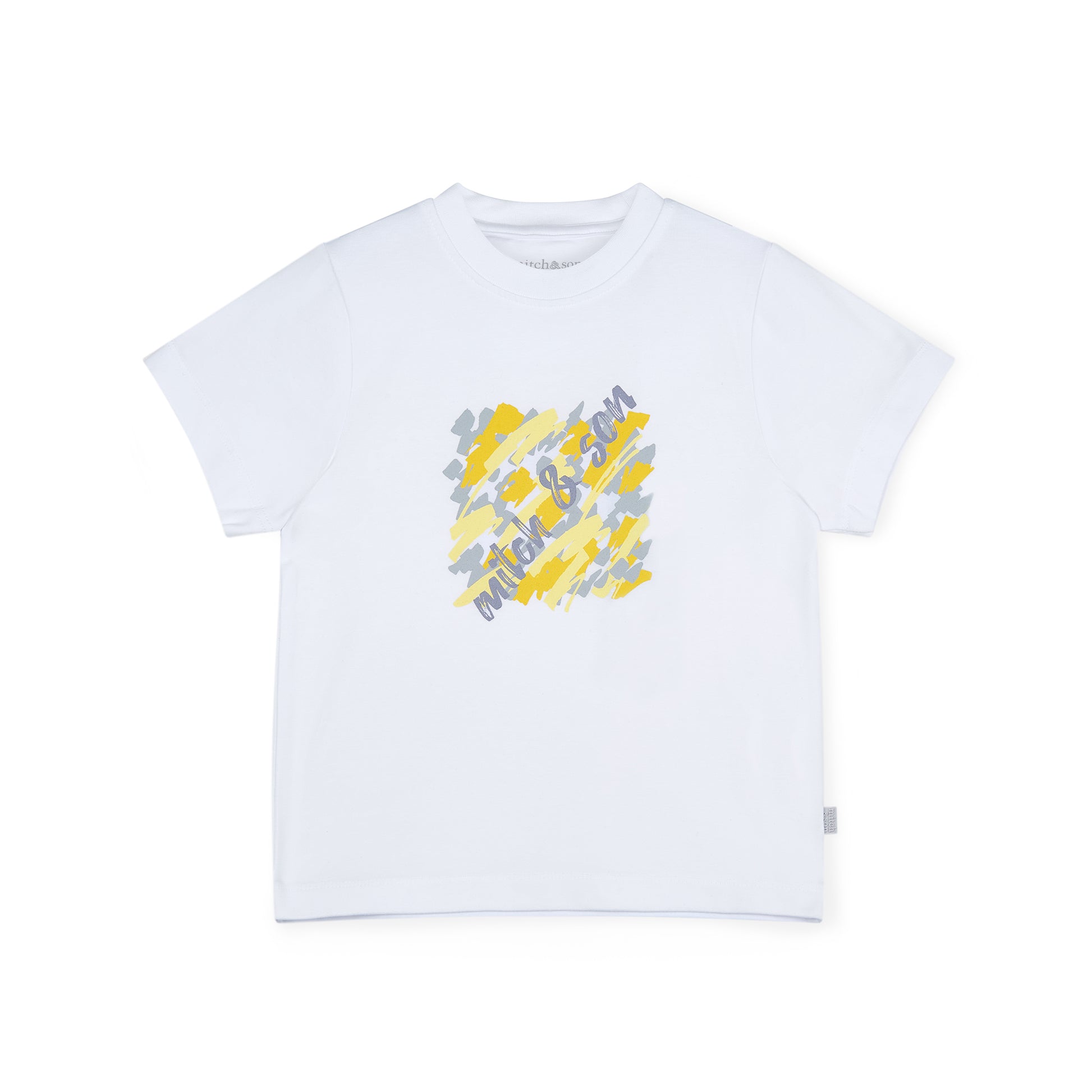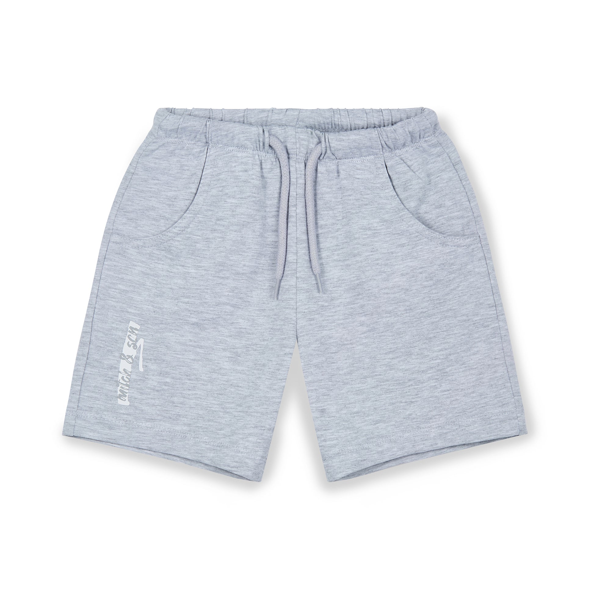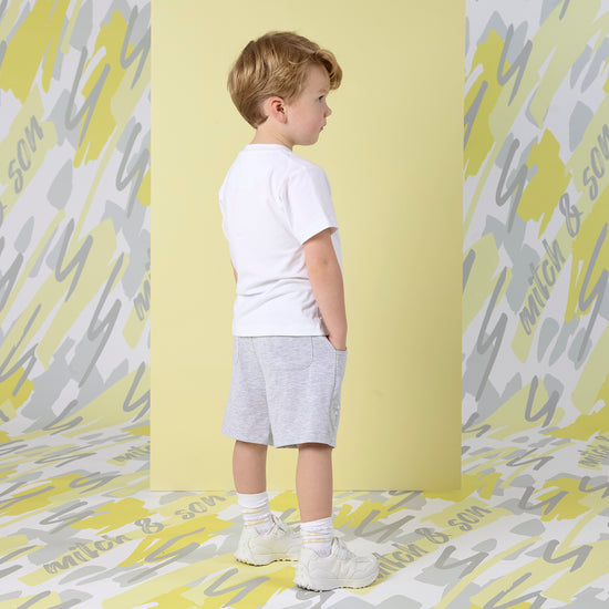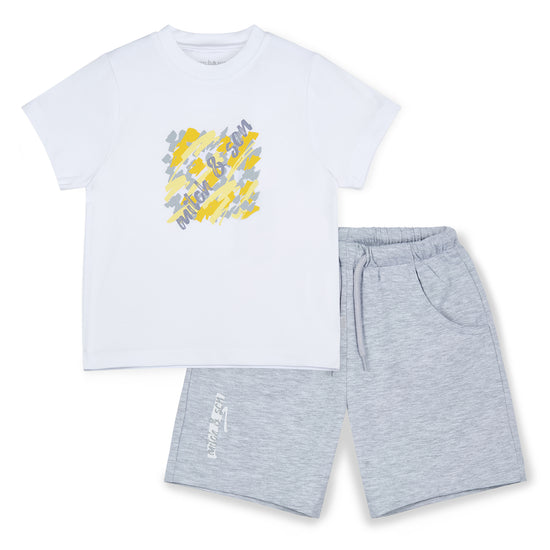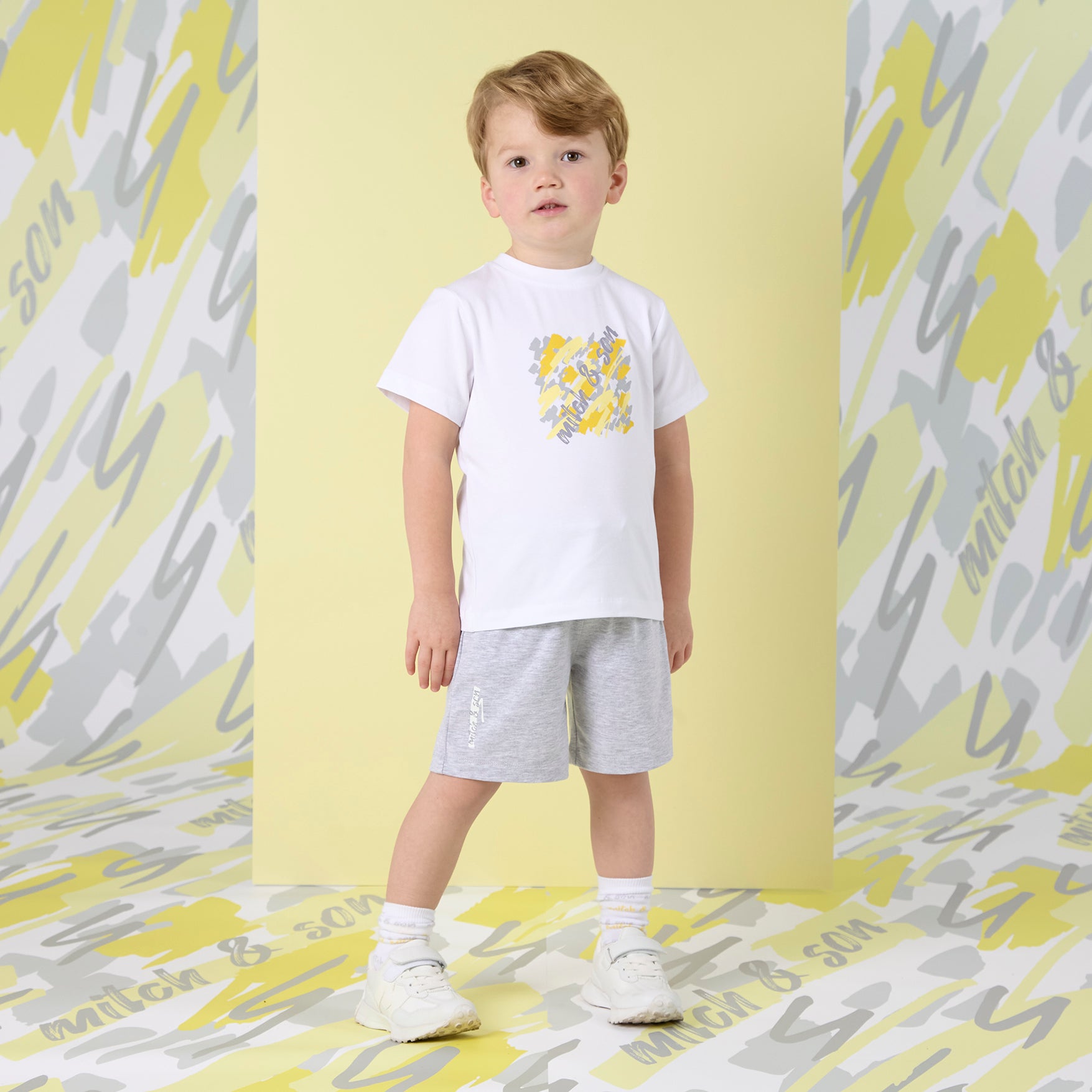 The Gino cotton jersey t-shirt and short set features printed doodle artwork on the front and is paired with contrast grey melange shorts with printed logo artwork