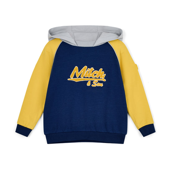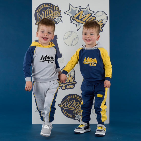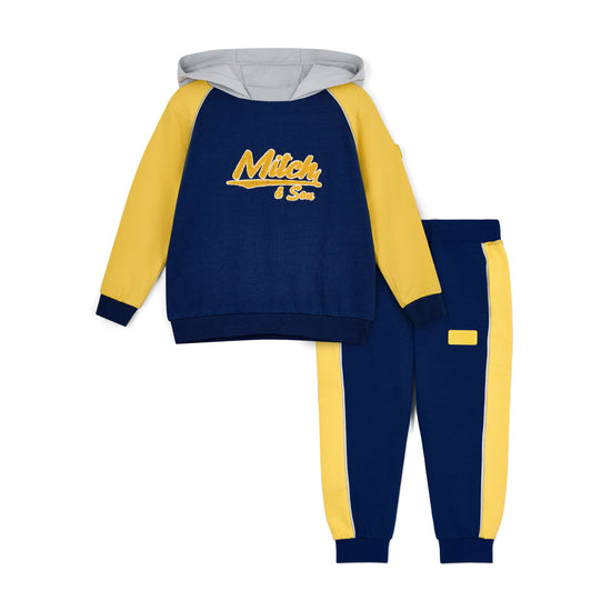 The Kash Hoodie Tracksuit features soft touch raglan fabric and a cool colourblock design with contrast sleeves and stripe down the side of the joggers. Finished with a contrast cosy hood, Mitch and Son logo artwork on the front and logo badge on one leg.