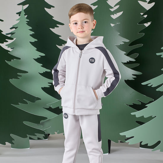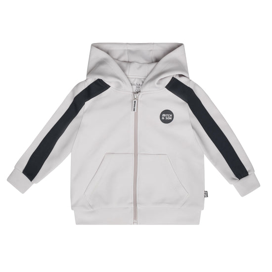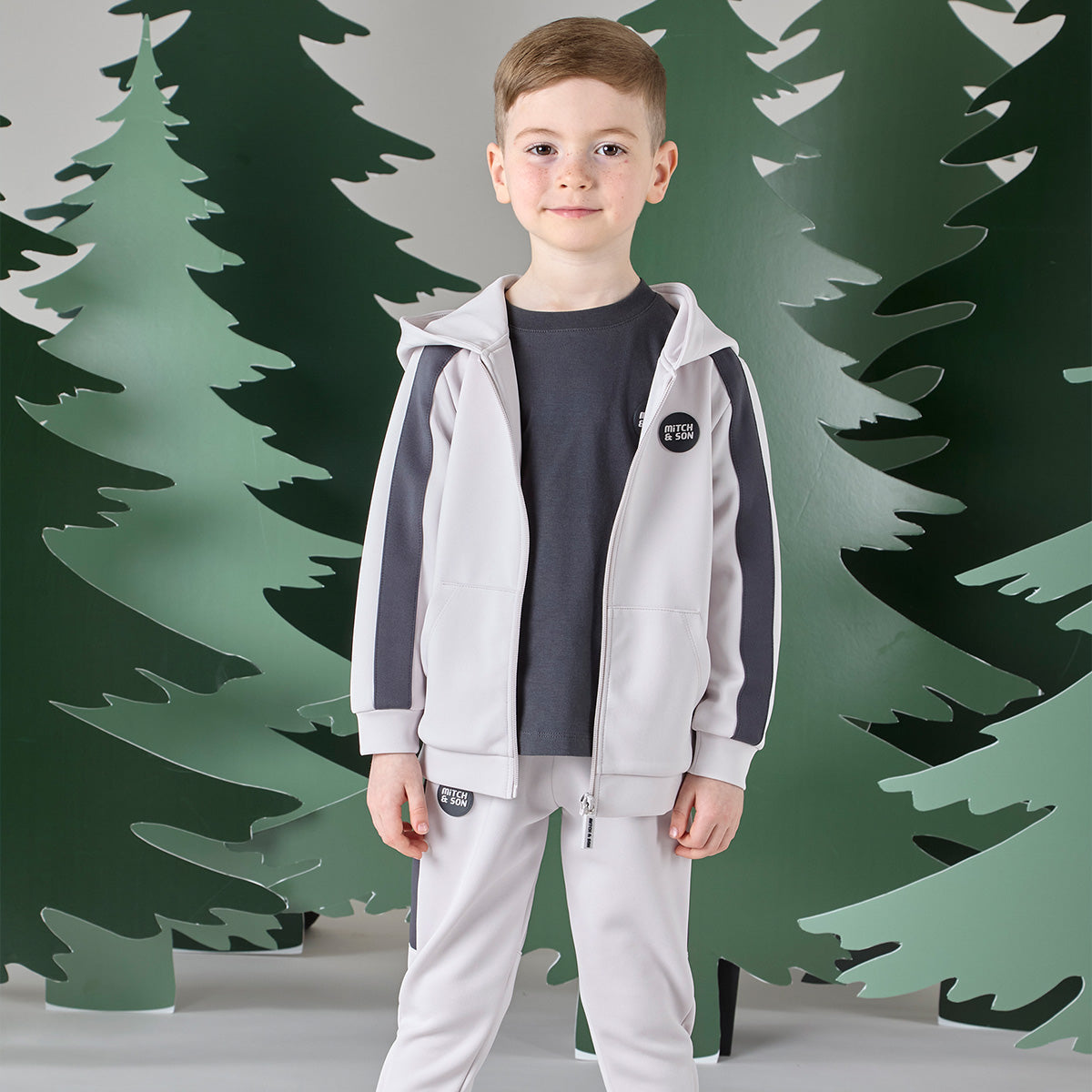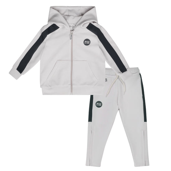 The Calvin hooded poly zipper tracksuit features contrast side panels, rubber logo badges and zippered ankles.