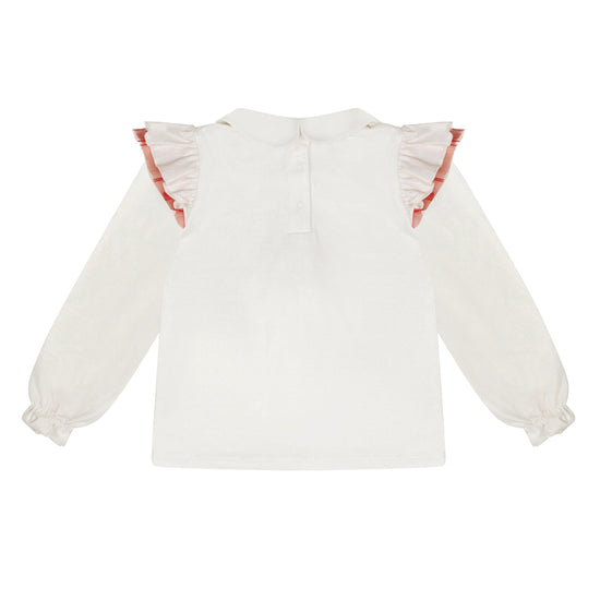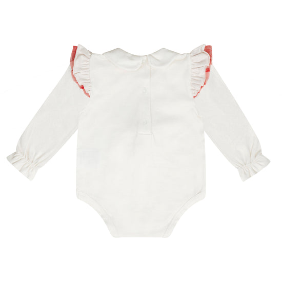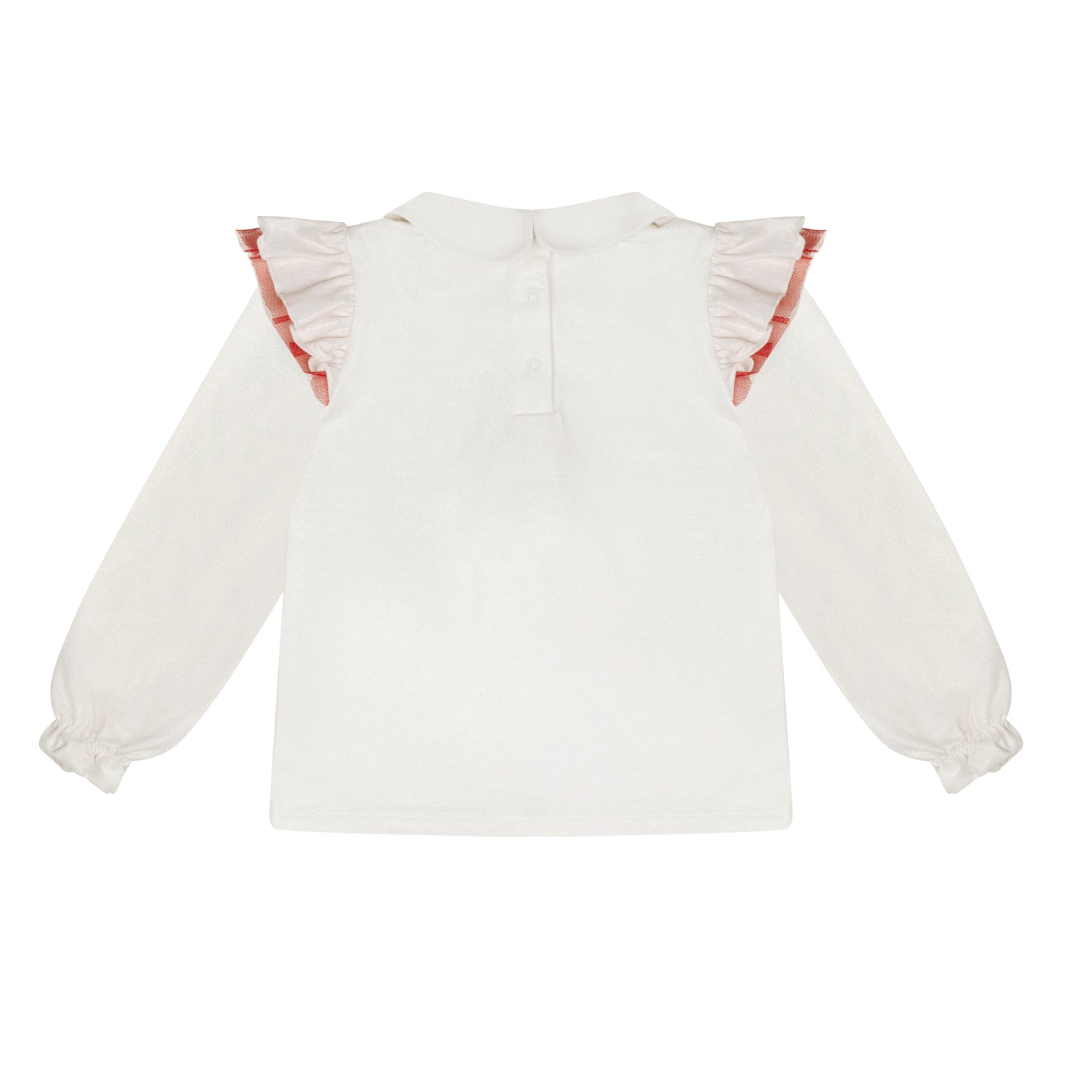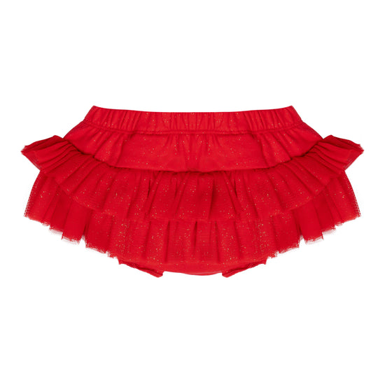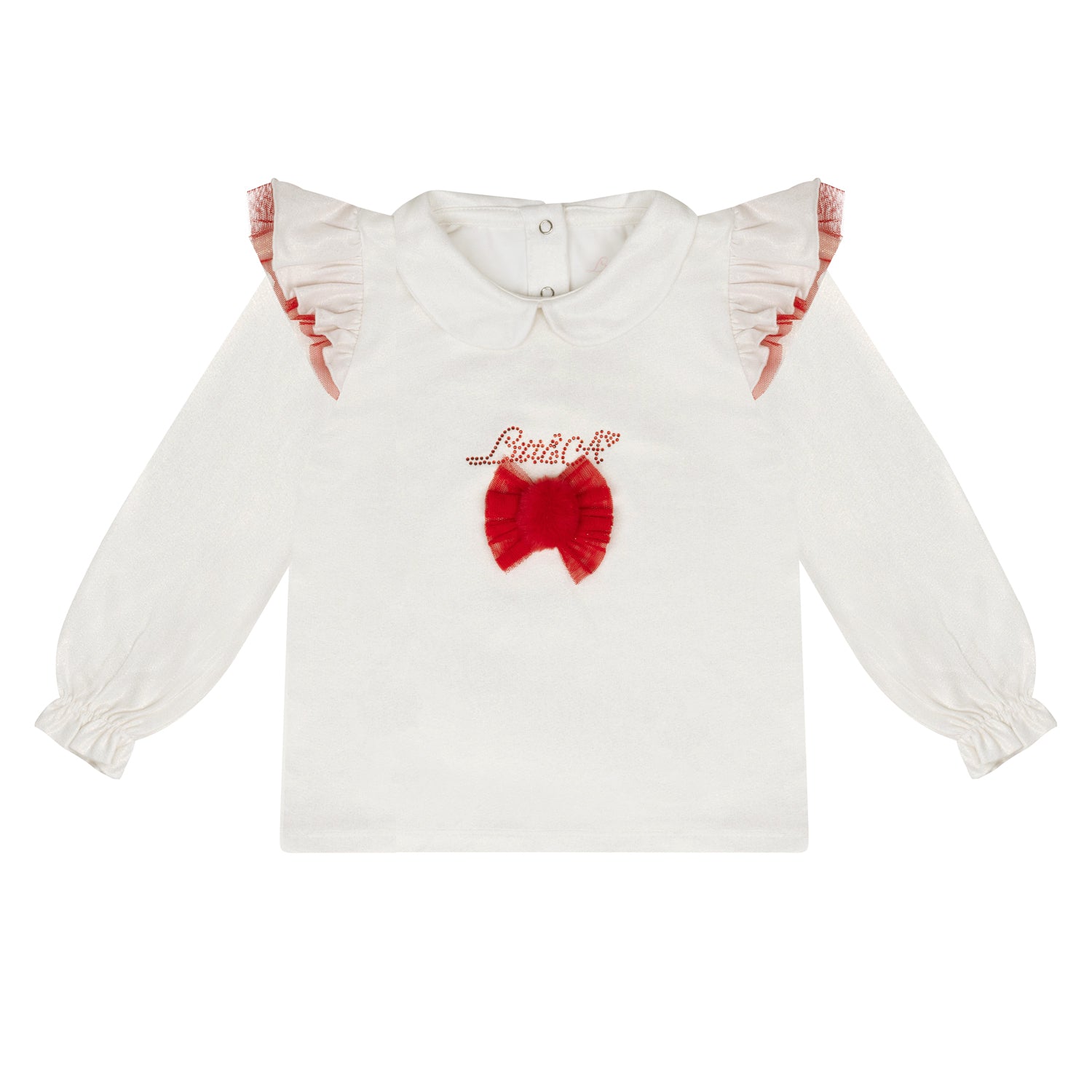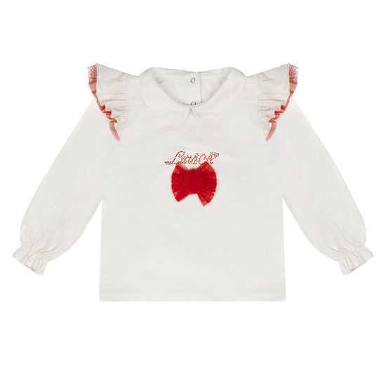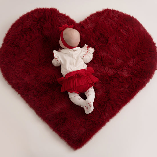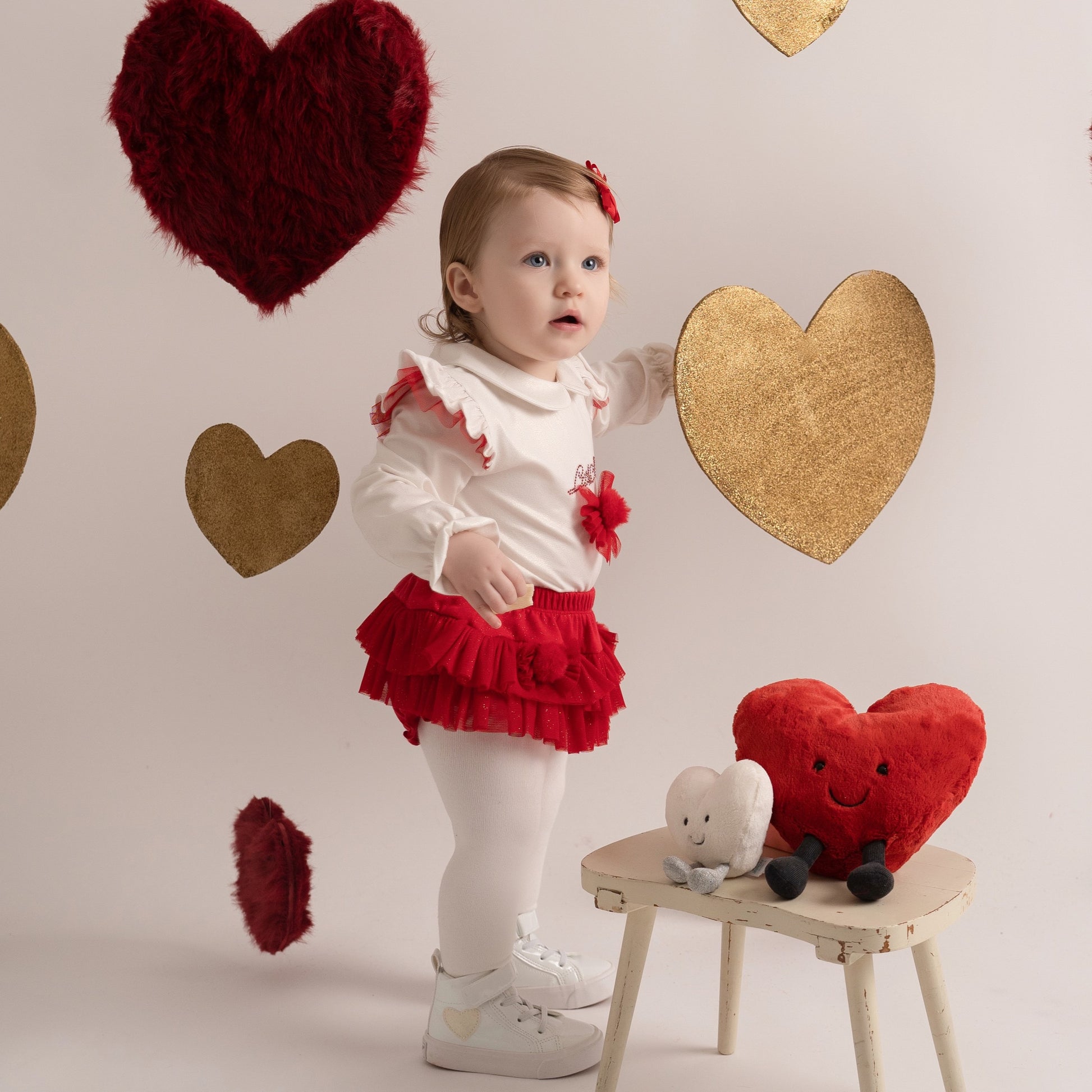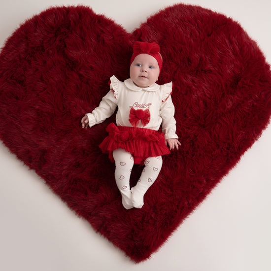 The adorable Heidi Set features a red tulle frill jam pant paired with a contrast white vest/top. The vest has pretty frills at the shoulders and diamante logo on the front with tulle and faux fur bow applique.