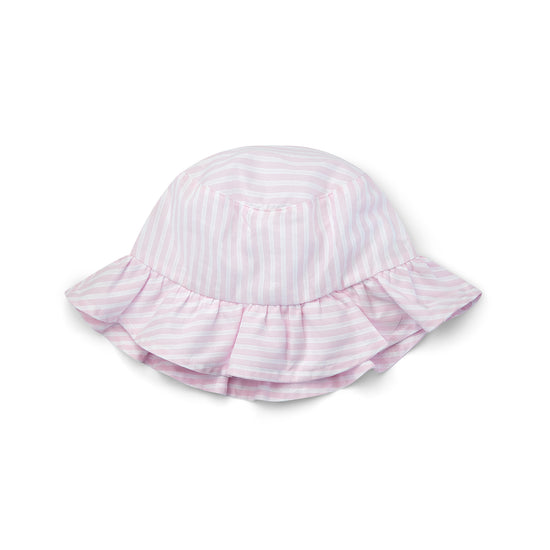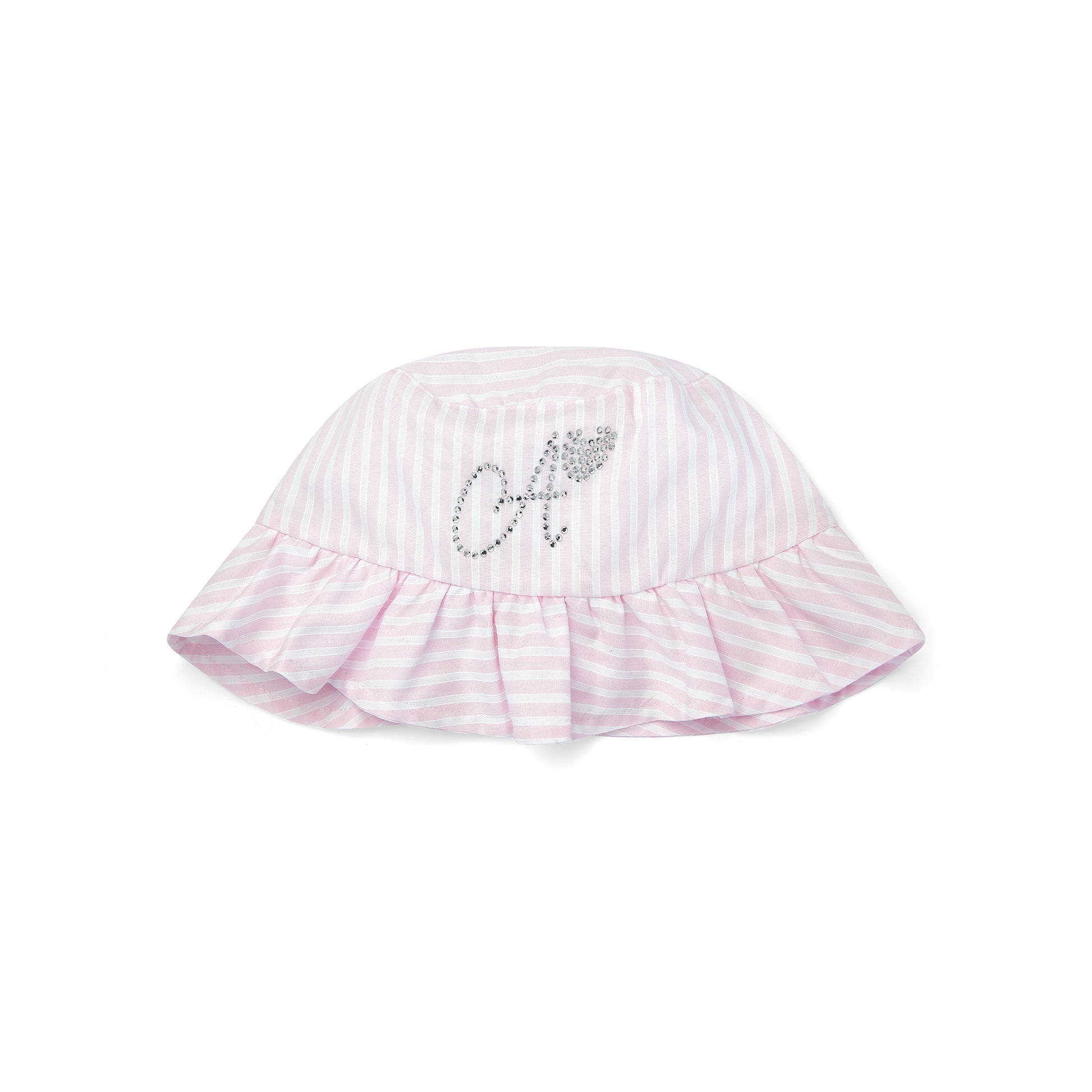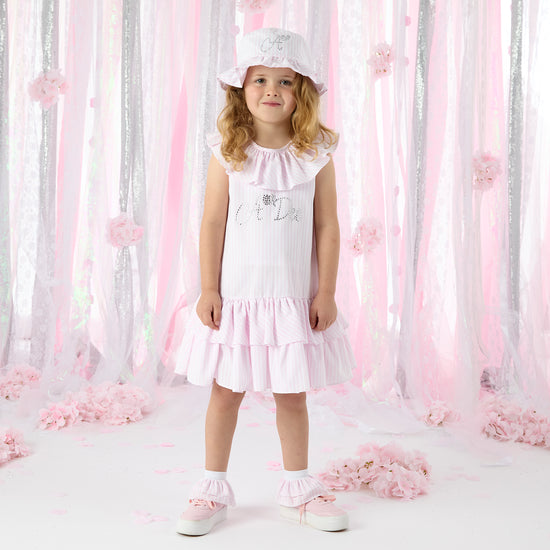 Complete the look in this pink stripe Dream bucket hat, featuring a frill hem and diamante logo on the front.