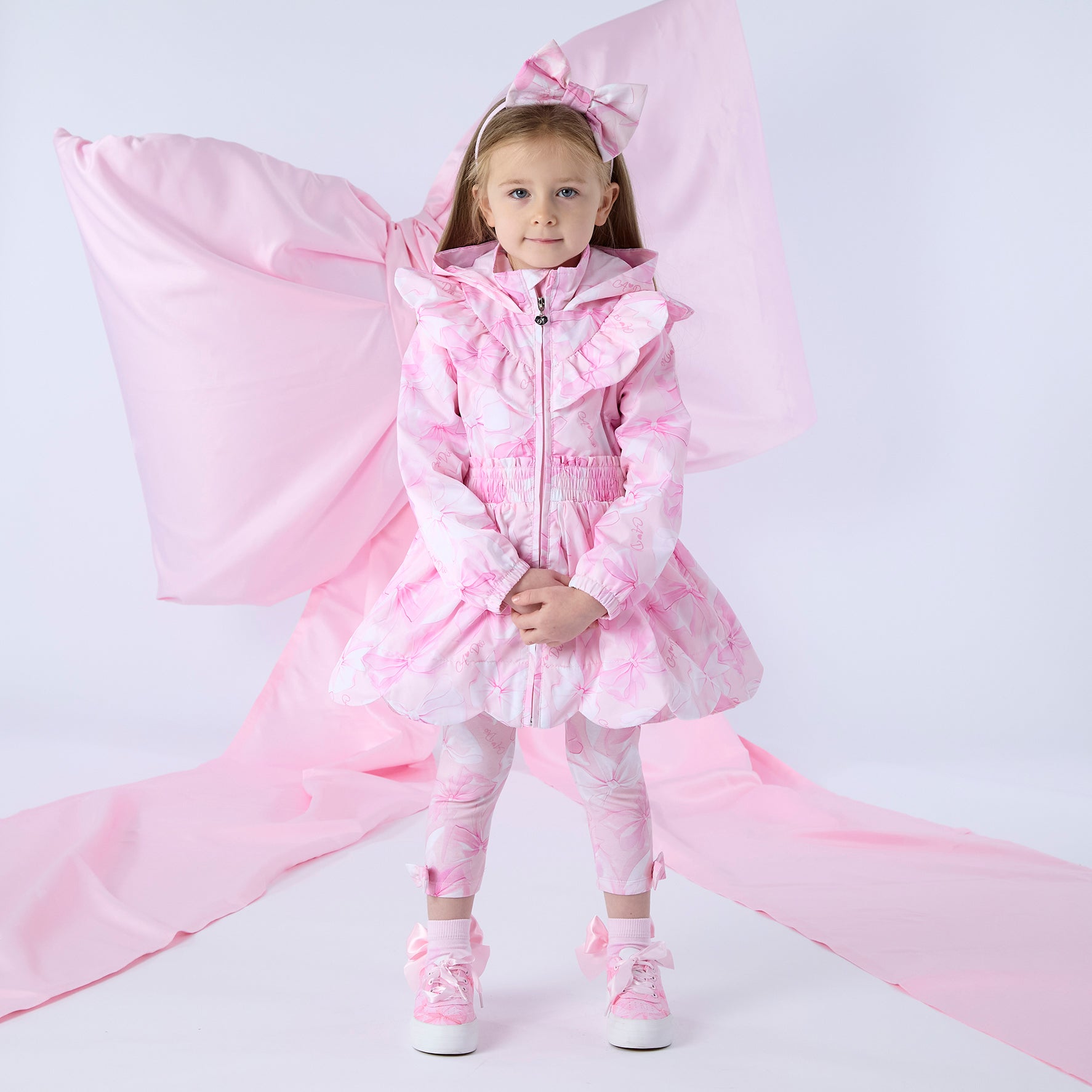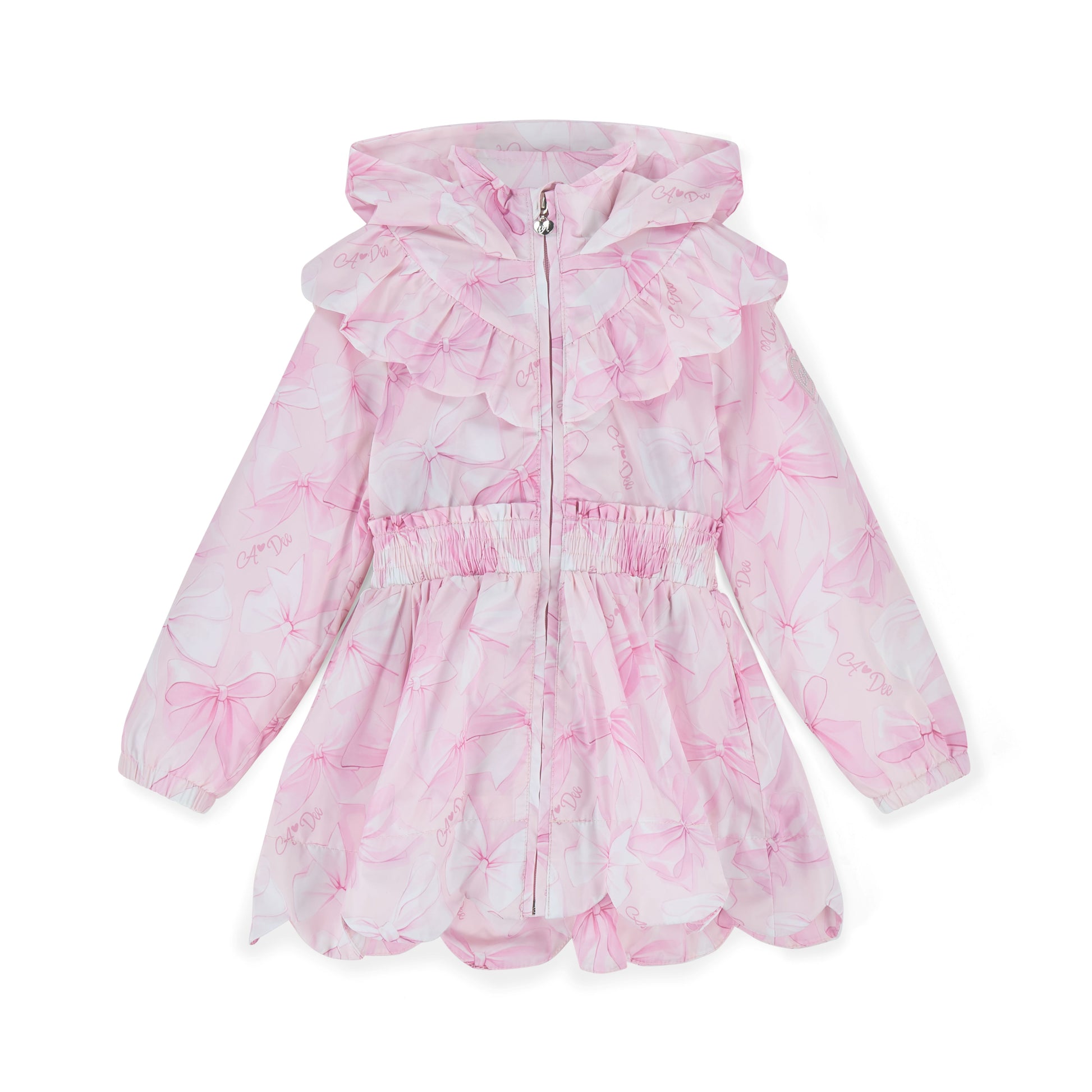 Introducing the River jacket. Made from silky polyester, it features an all-over bow print, scalloped frill hem with a frilly collar and oversized hood. Finished with a diamante zip, branded puller and logo badge on one arm.
