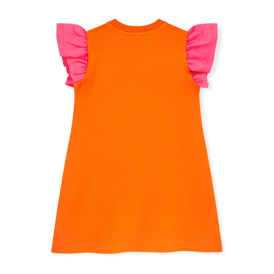 The Tegan dress is made from soft cotton featuring contrast frilly sleeves and a handbag artwork on the front.