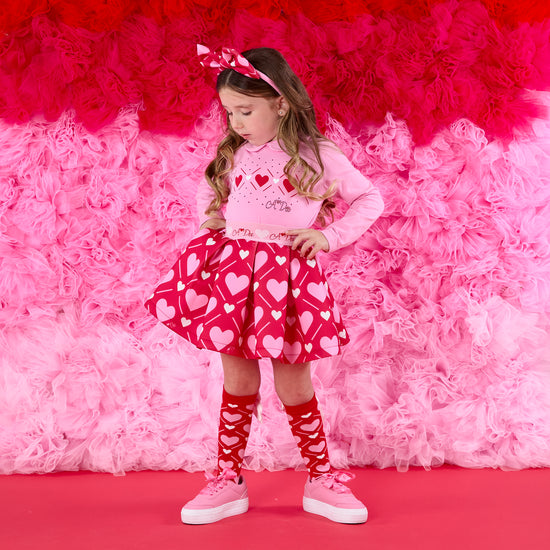 The Lyla skirt set comes with a box pleat 'Love Story' heart printed skirt featuring an elastic waistband for a comfortable fit. Paired with a long-sleeved collared top with a pretty artwork coming in two colourways. This set is just what an A*Dee girl needs this season!