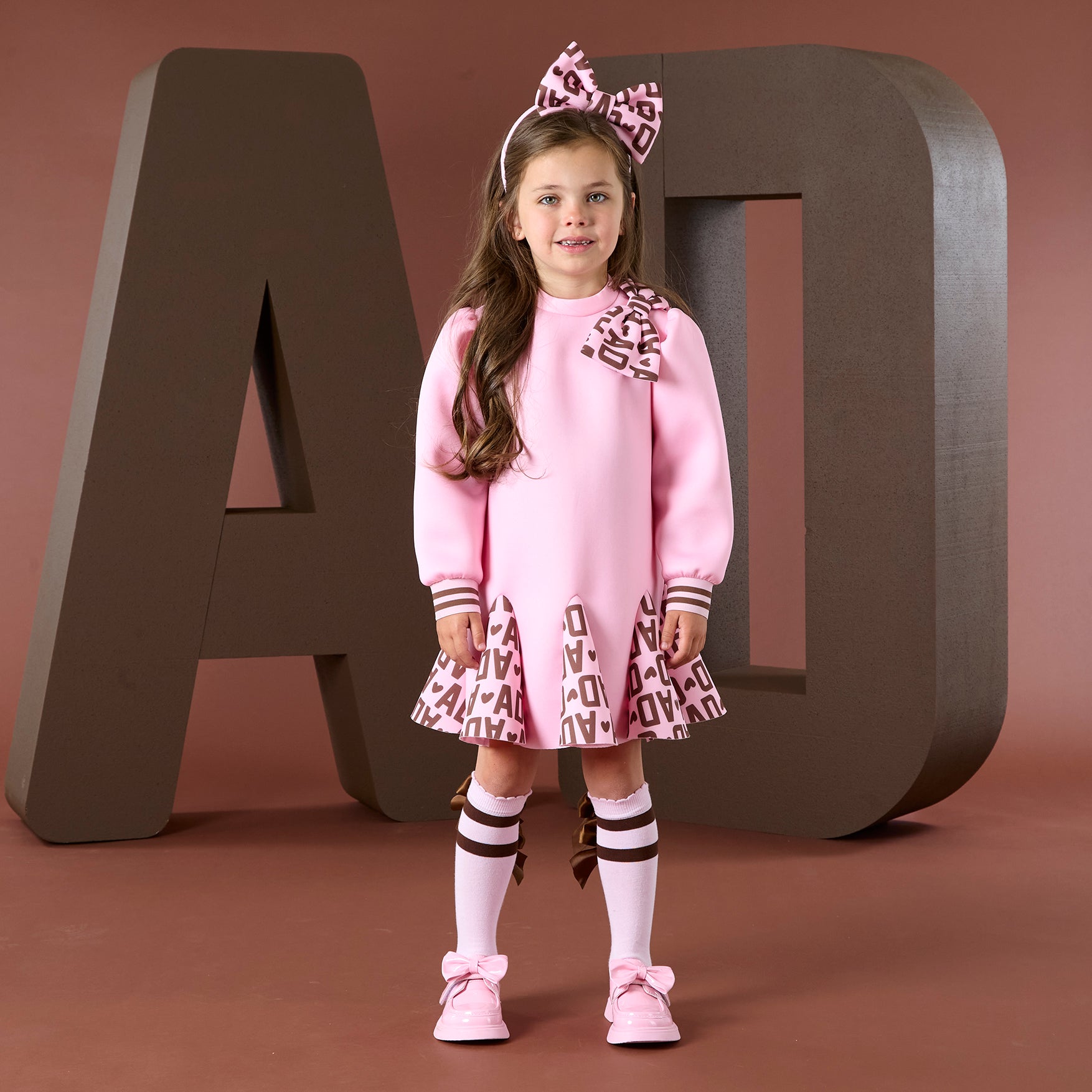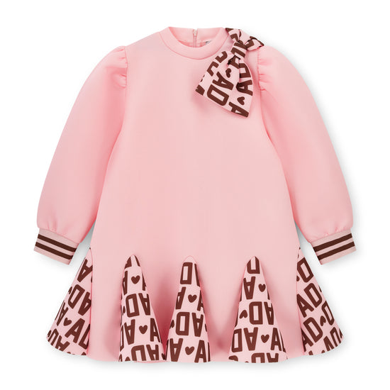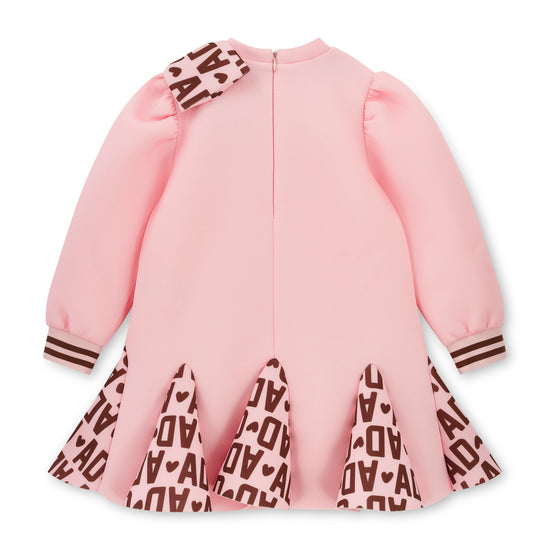 The Maisie dress comes in two colourways. The Maisie comes in our cute initial icon print with a box pleat skirt, puffed sleeves and a pink bow applique on the shoulder