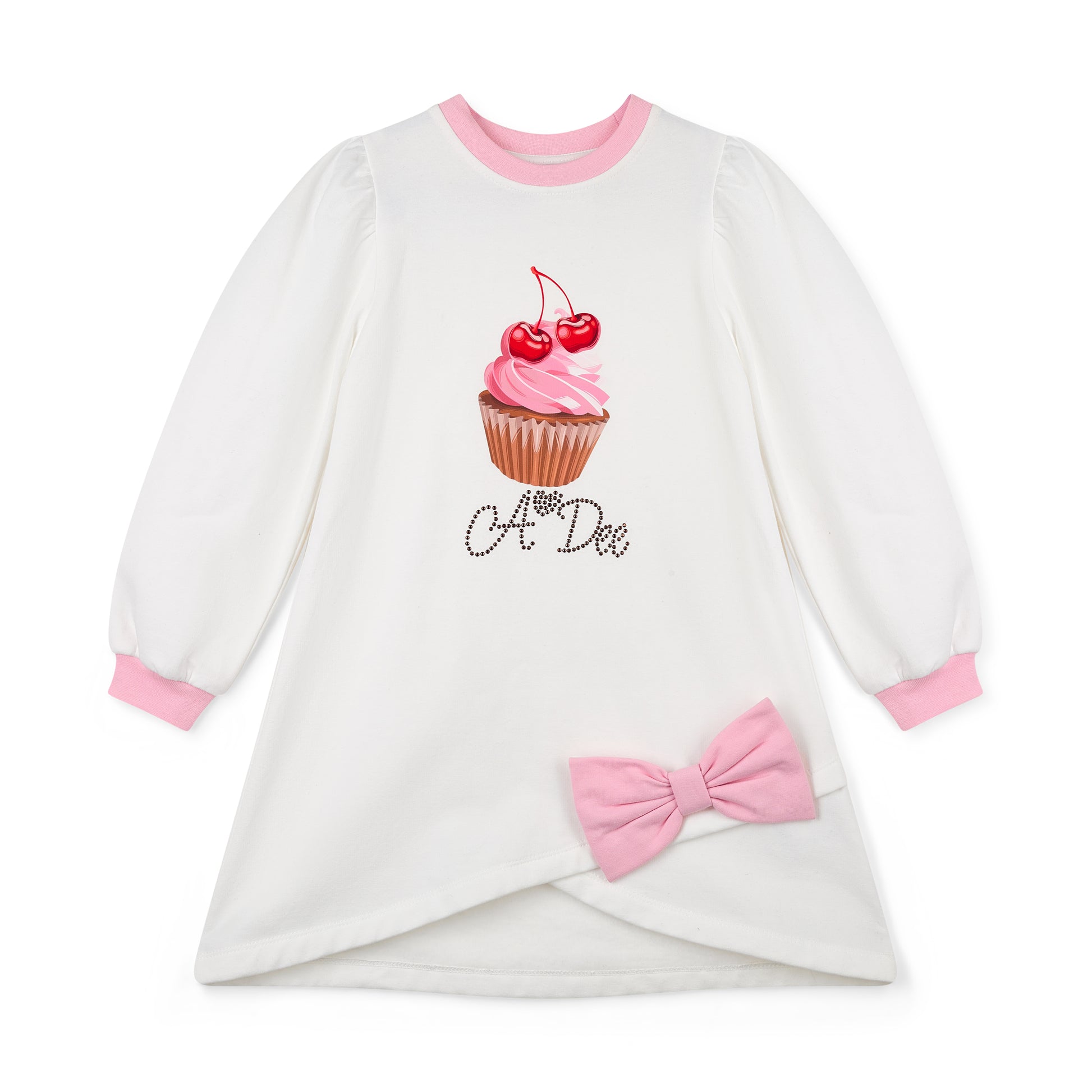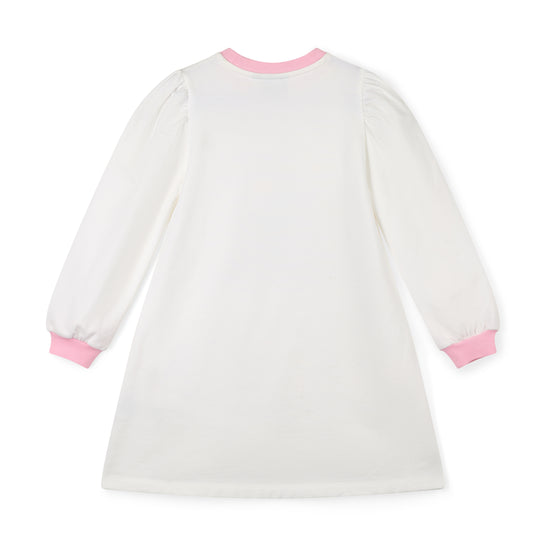 The Michelle sweat dress features a unique teddy bear bakery artwork on the front with an even cuter bow detail at the side. Complete with puff sleeves.