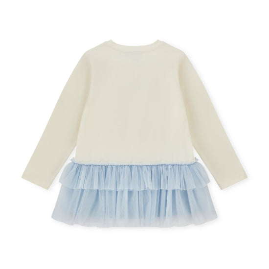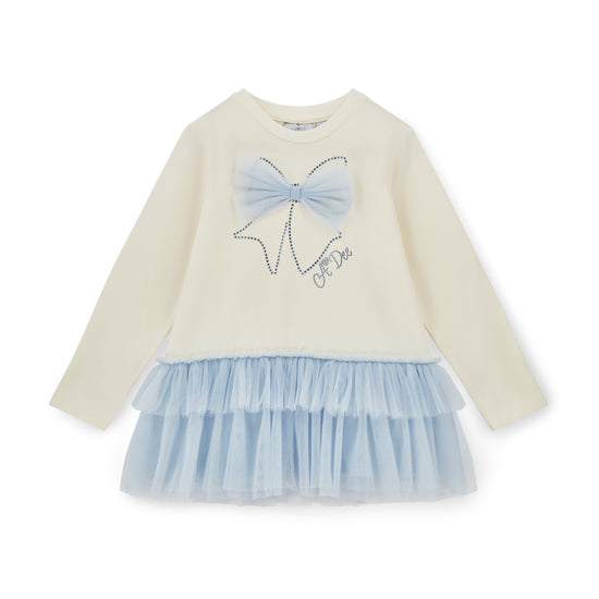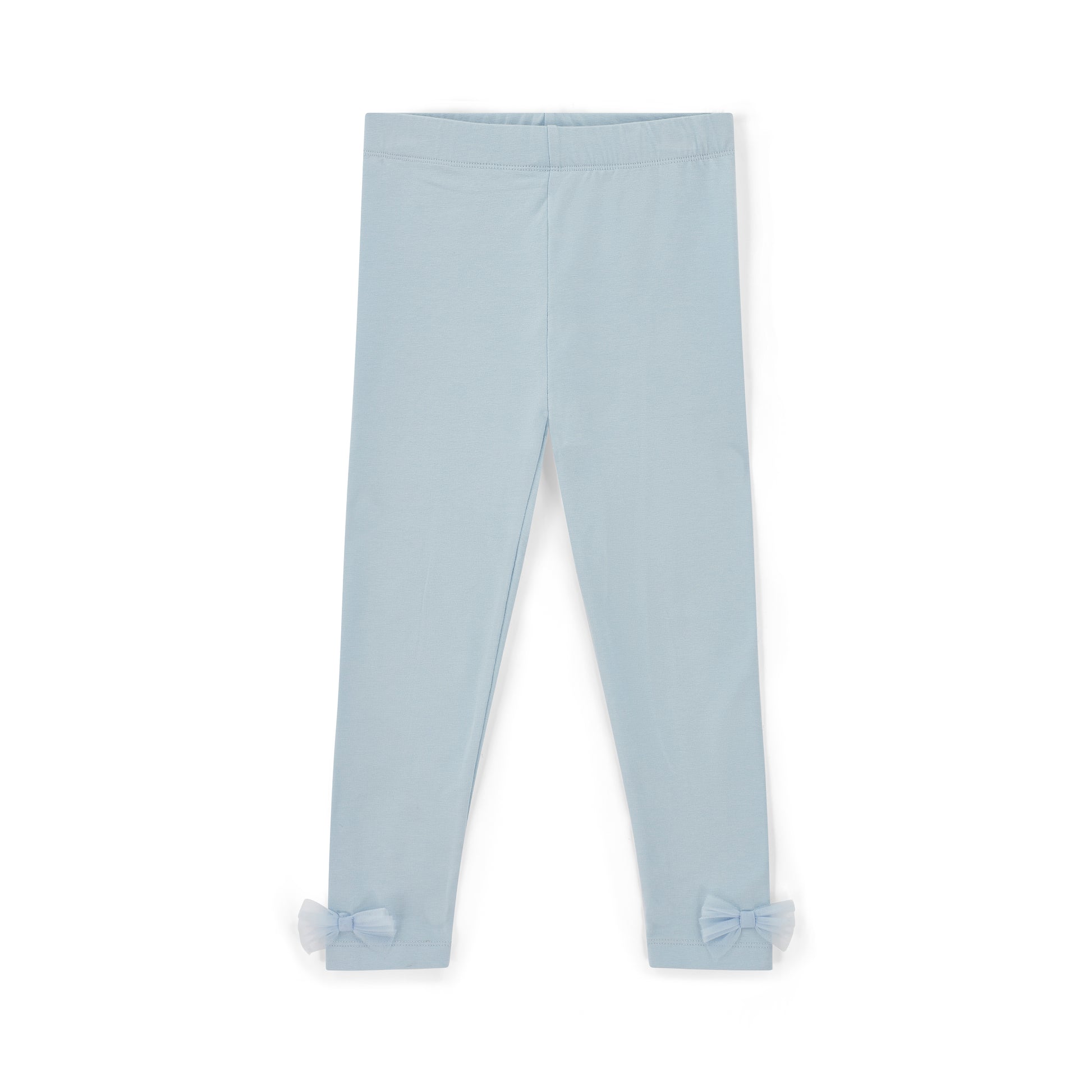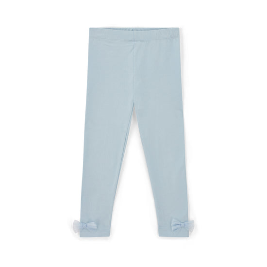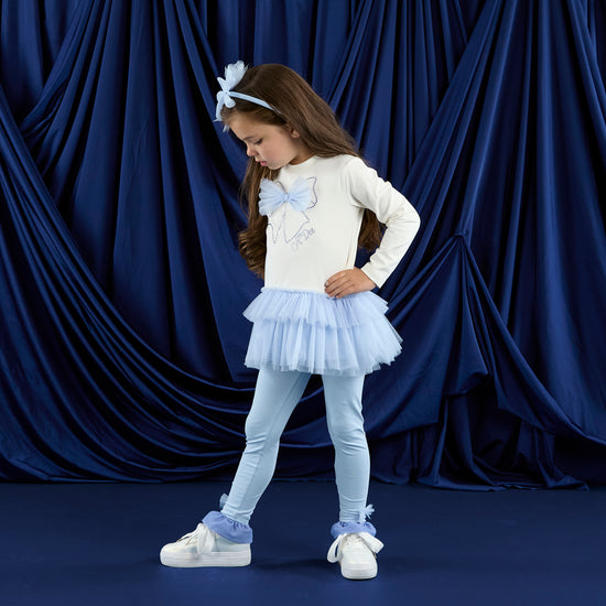 The Mila legging set features a long-sleeve top with a triple tulle hem, as well as a cute bow detail on the front. Paired with matching comfortable blue leggings, finished with contrast bow details.